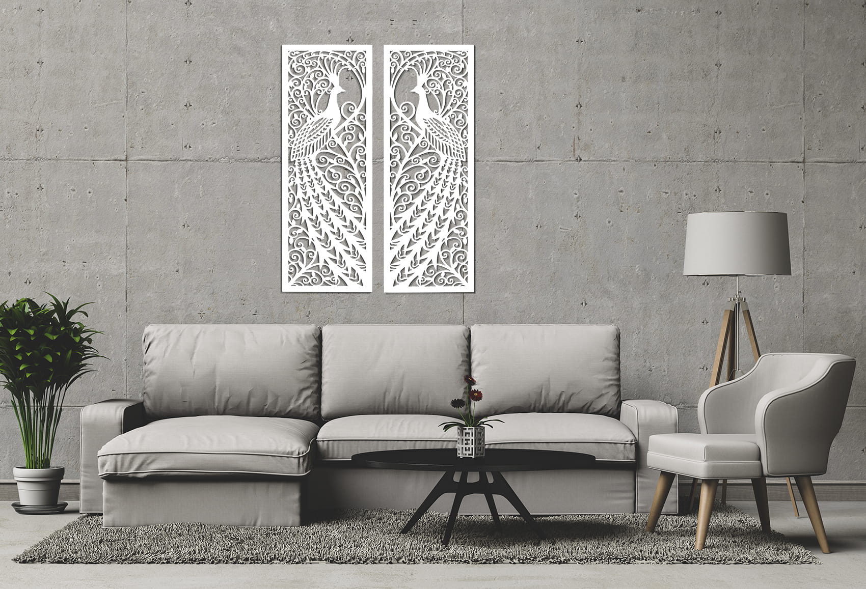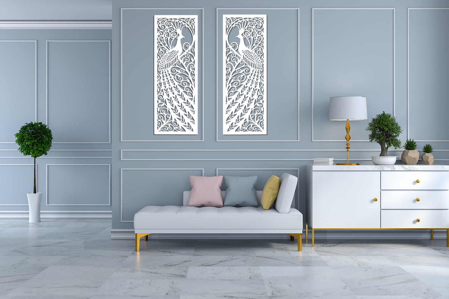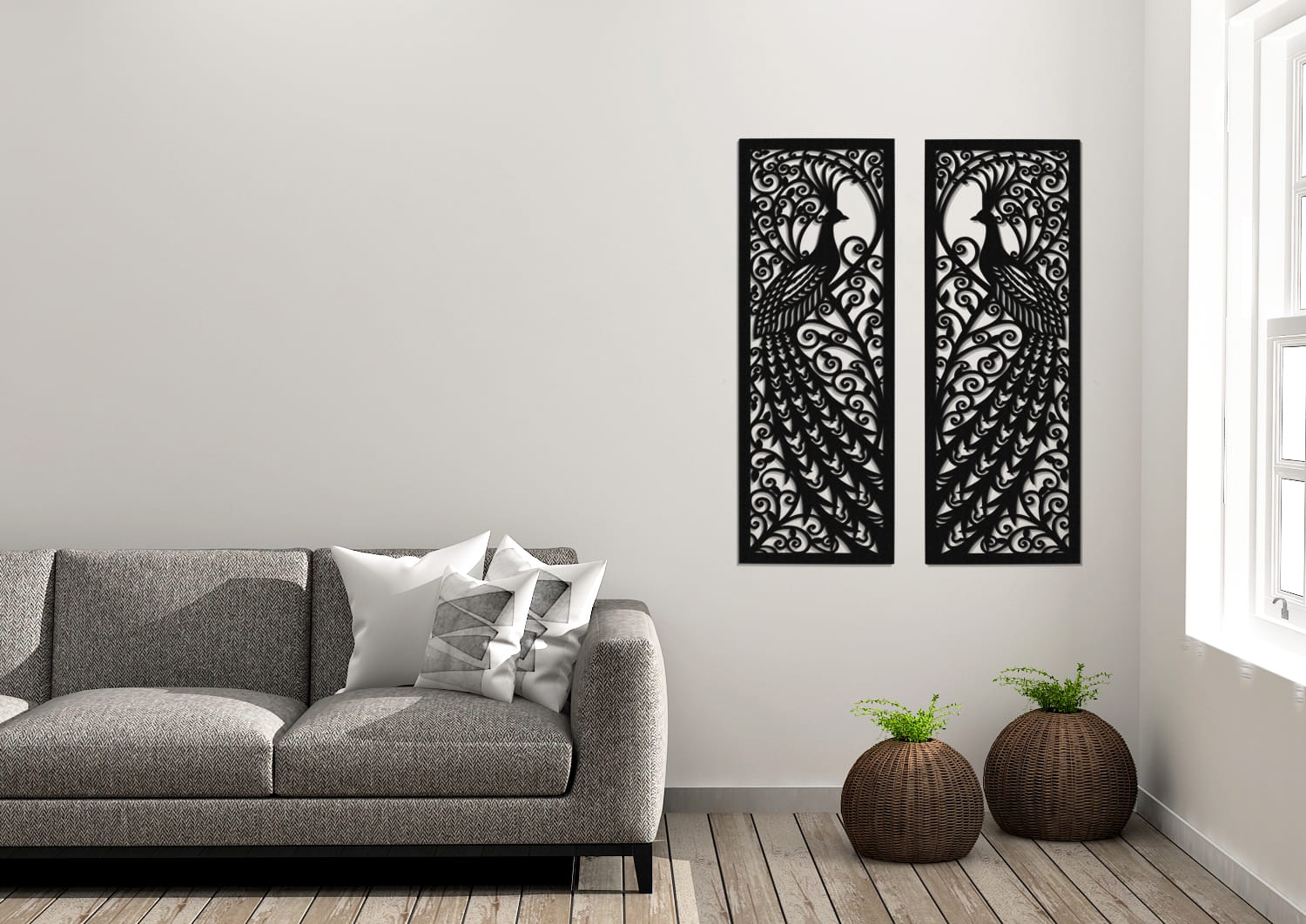 Zestaw 2 ażurowych dekorów ściennych, inspirowanych stylem secesyjnym z dekoracyjnym motywem pawia. Styl Art Nouveau przeżywał swój rozkwit na przełomie XIX/XX wieku. Dekoracja wniesie do Twojego wnętrza nutę klasyki i elegancji. Oryginalna dekoracja ścienna 3D ozdobi Twoją ścianę w salonie czy w sypialni, idealna nad sofę, łóżko czy komodę.