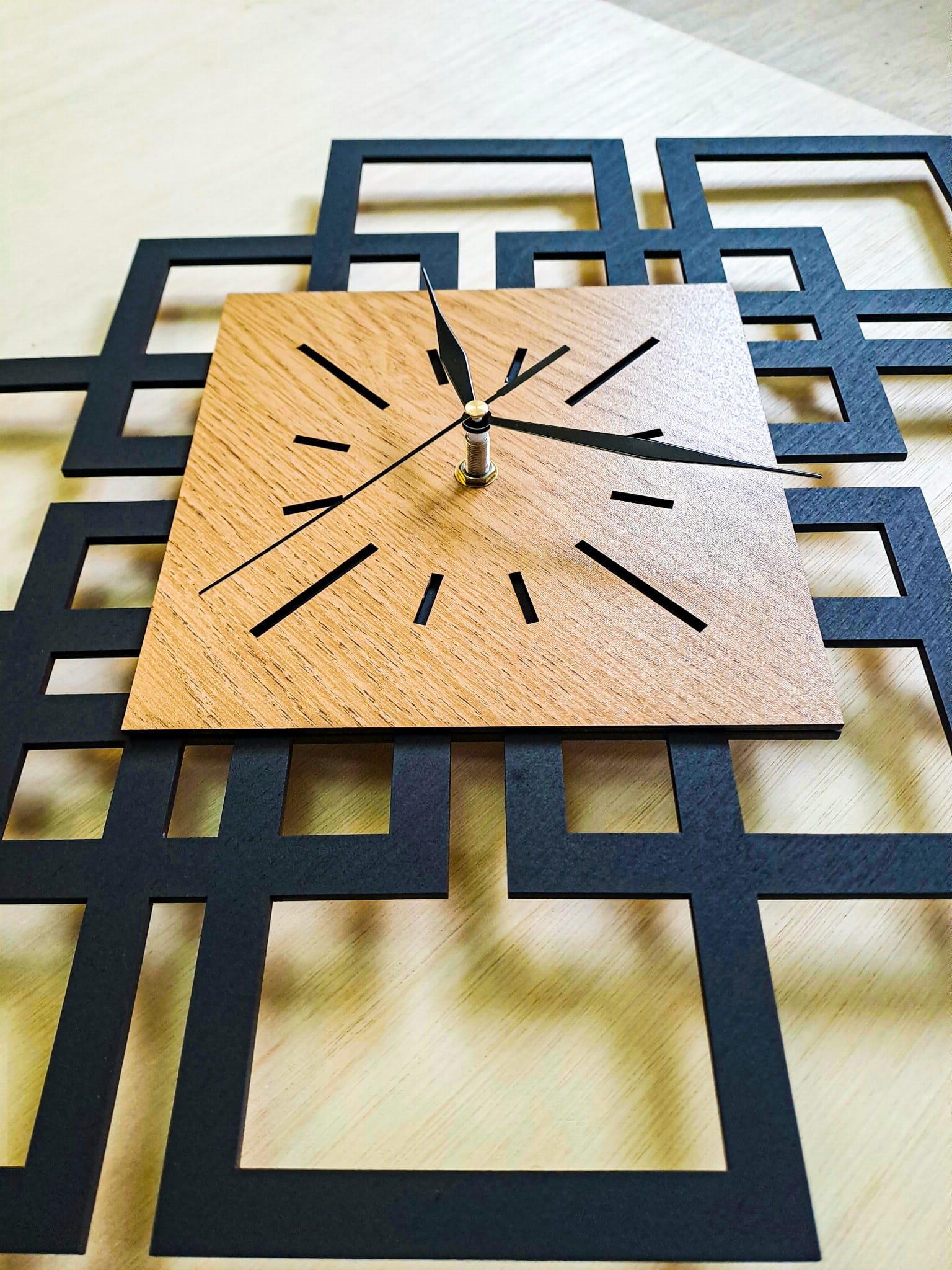 DEKORACYJNY DREWNIANY ZEGAR, NOWOCZESNY, LOFT, STYL INDUSTRIALNY, DREWNO,MINIMALISTYCZNY, GEOMETRYCZNY, LOFTOWY , CZARNY - DĄB ZŁOTY