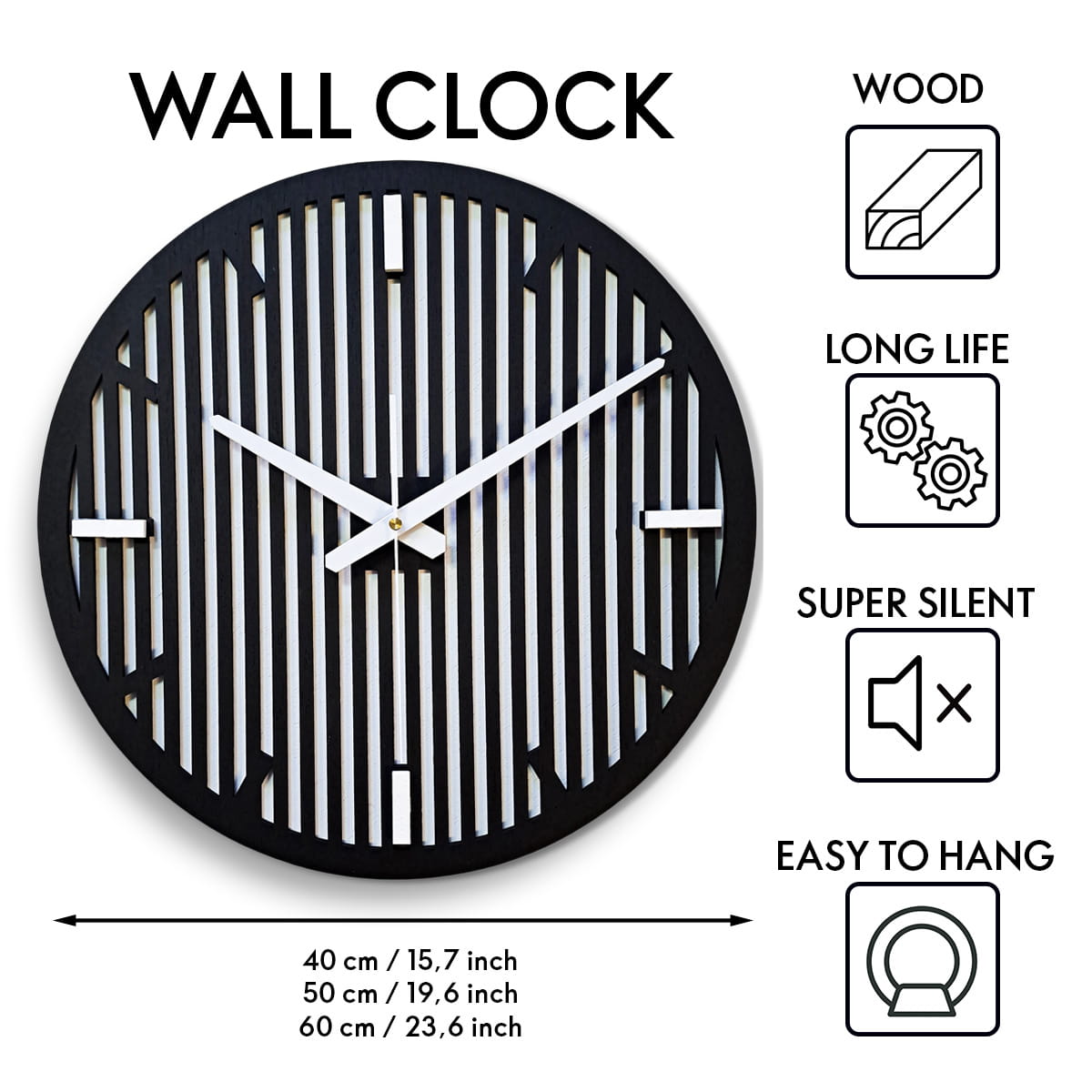 DEKORACYJNY DREWNIANY ZEGAR, NOWOCZESNY, LOFT, STYL INDUSTRIALNY, DREWNO,MINIMALISTYCZNY, LAMELE, CZARNY, 3 ROZMIARY