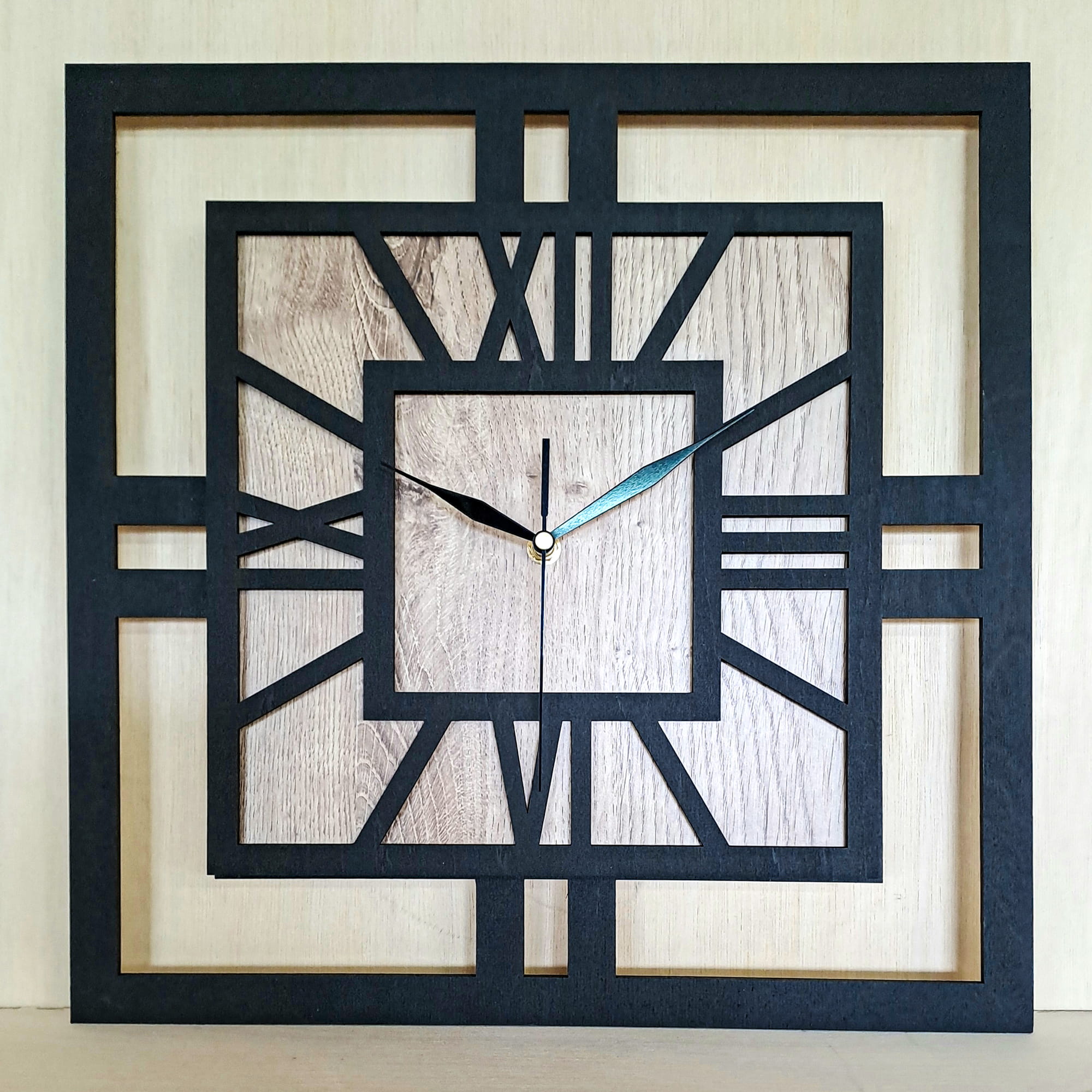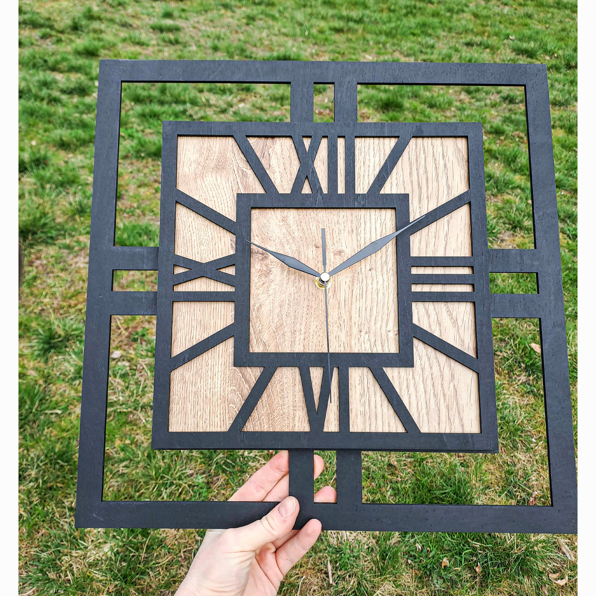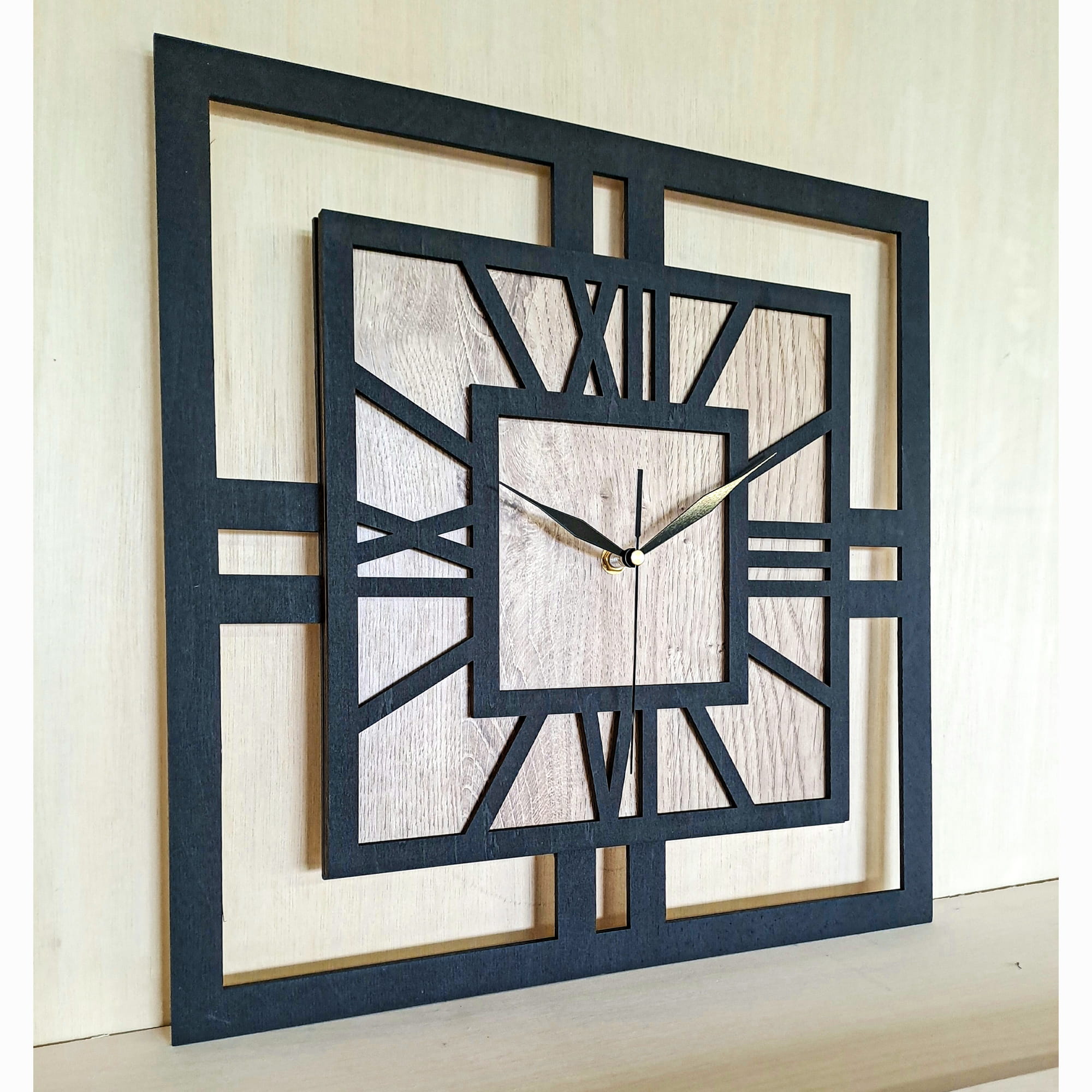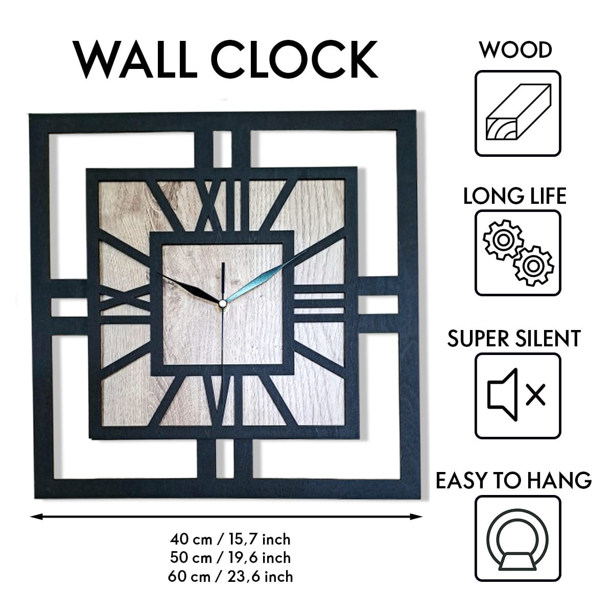 DEKORACYJNY DREWNIANY ZEGAR, NOWOCZESNY, LOFT, STYL INDUSTRIALNY, KWADRAT, DREWNO, 3 ROZMIARY