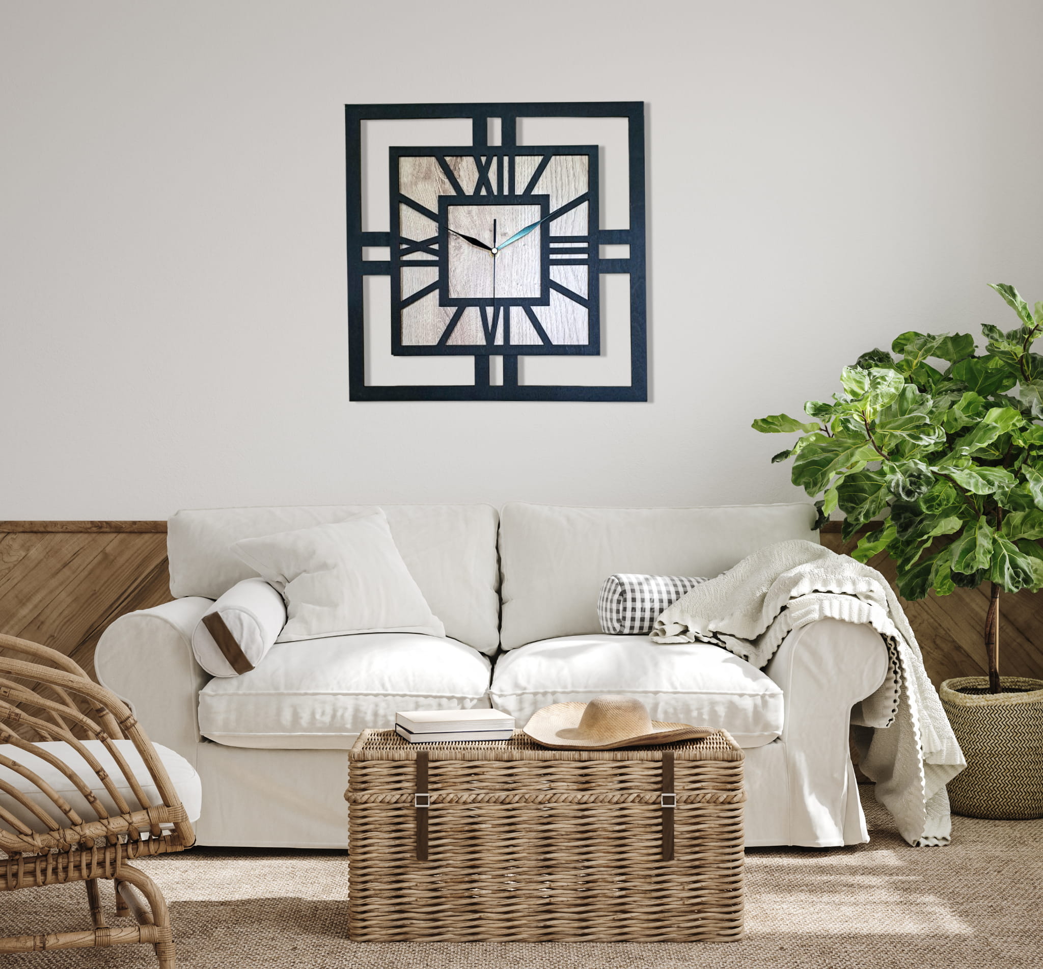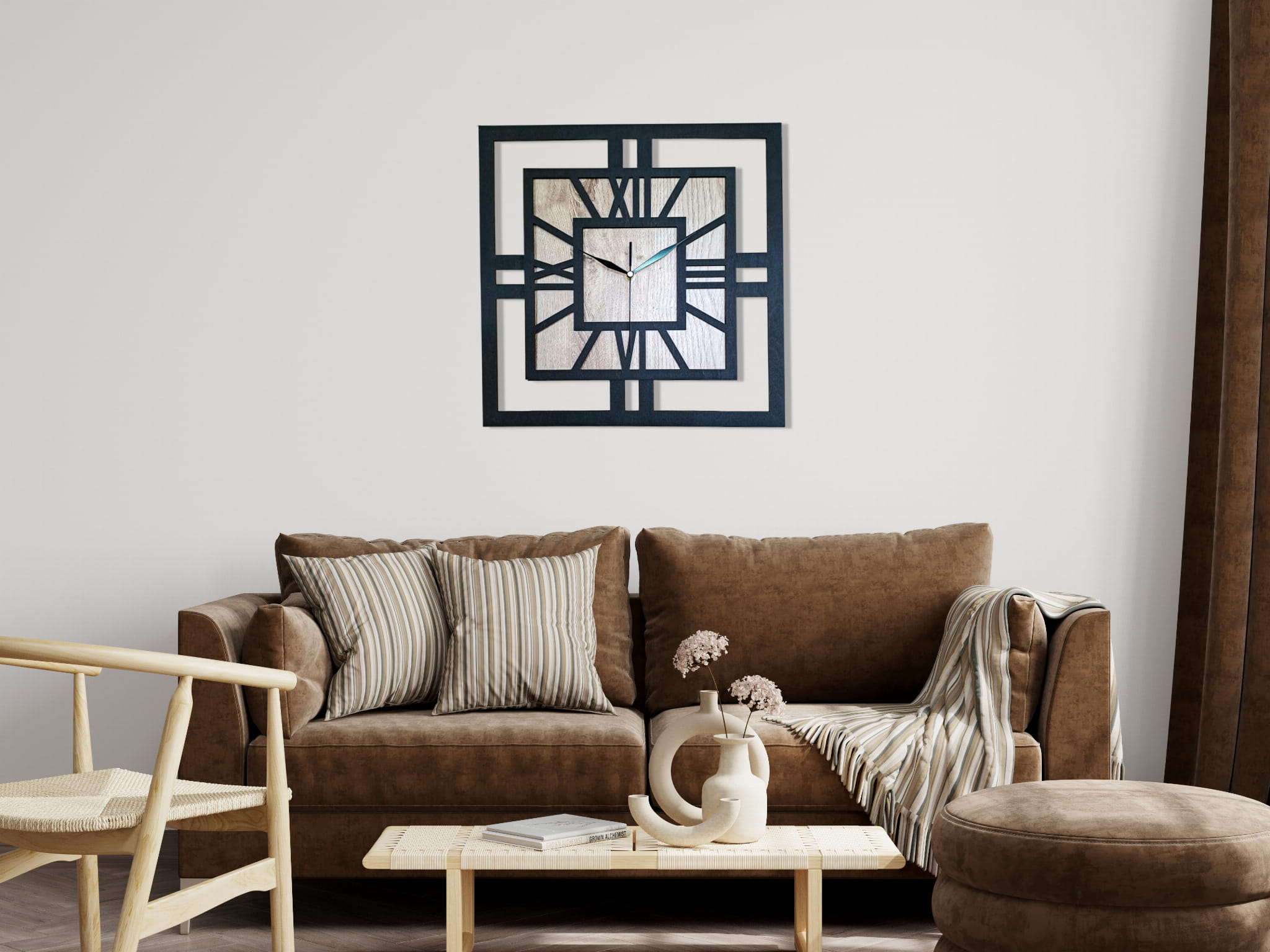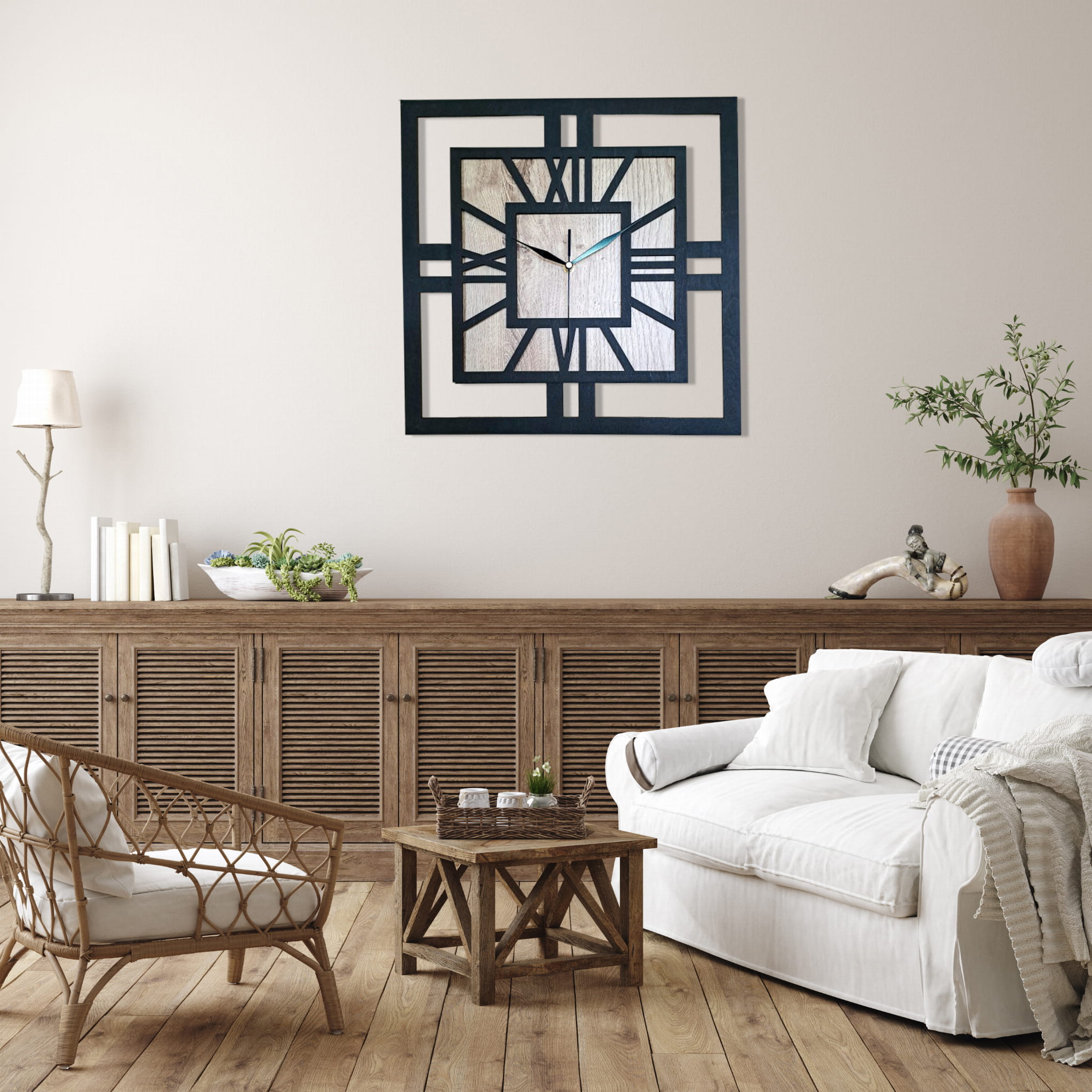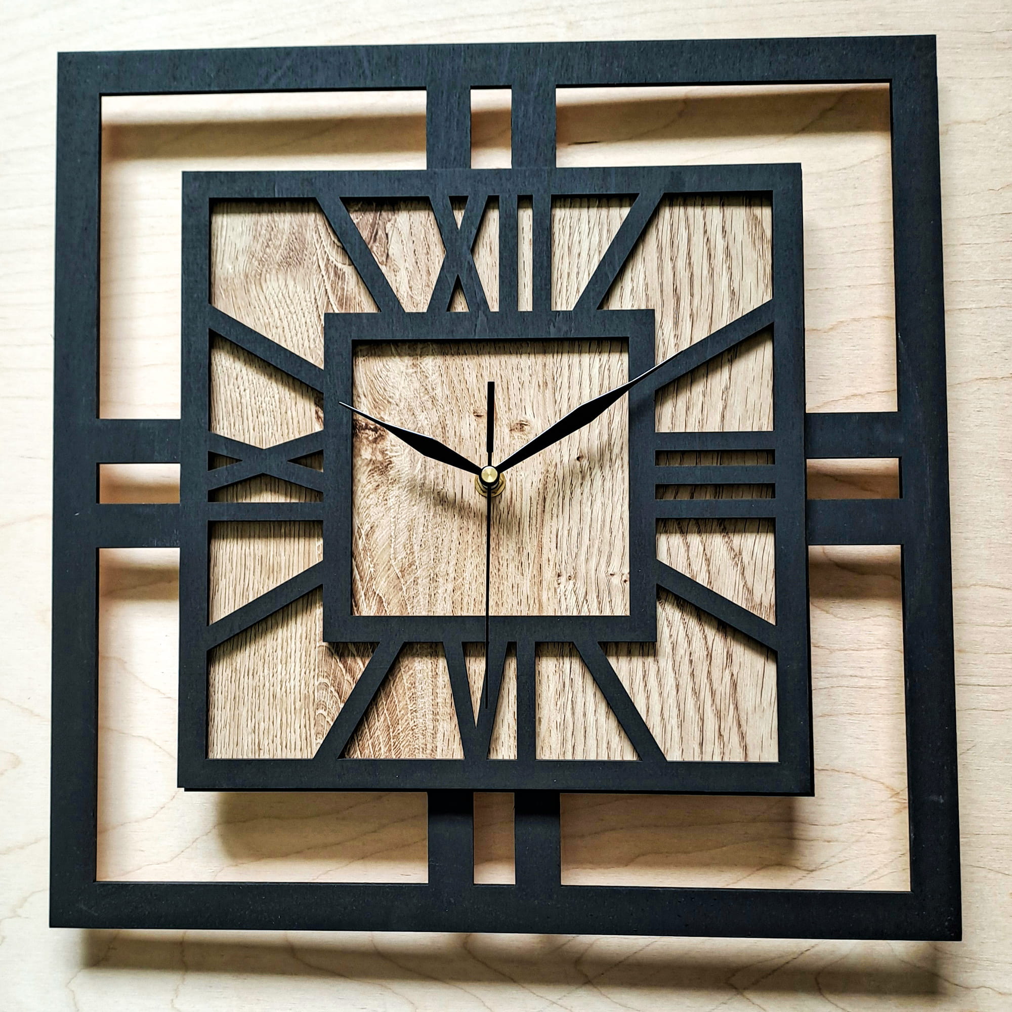 DEKORACYJNY DREWNIANY ZEGAR, NOWOCZESNY, LOFT, STYL INDUSTRIALNY, KWADRAT, DREWNO, 3 ROZMIARY