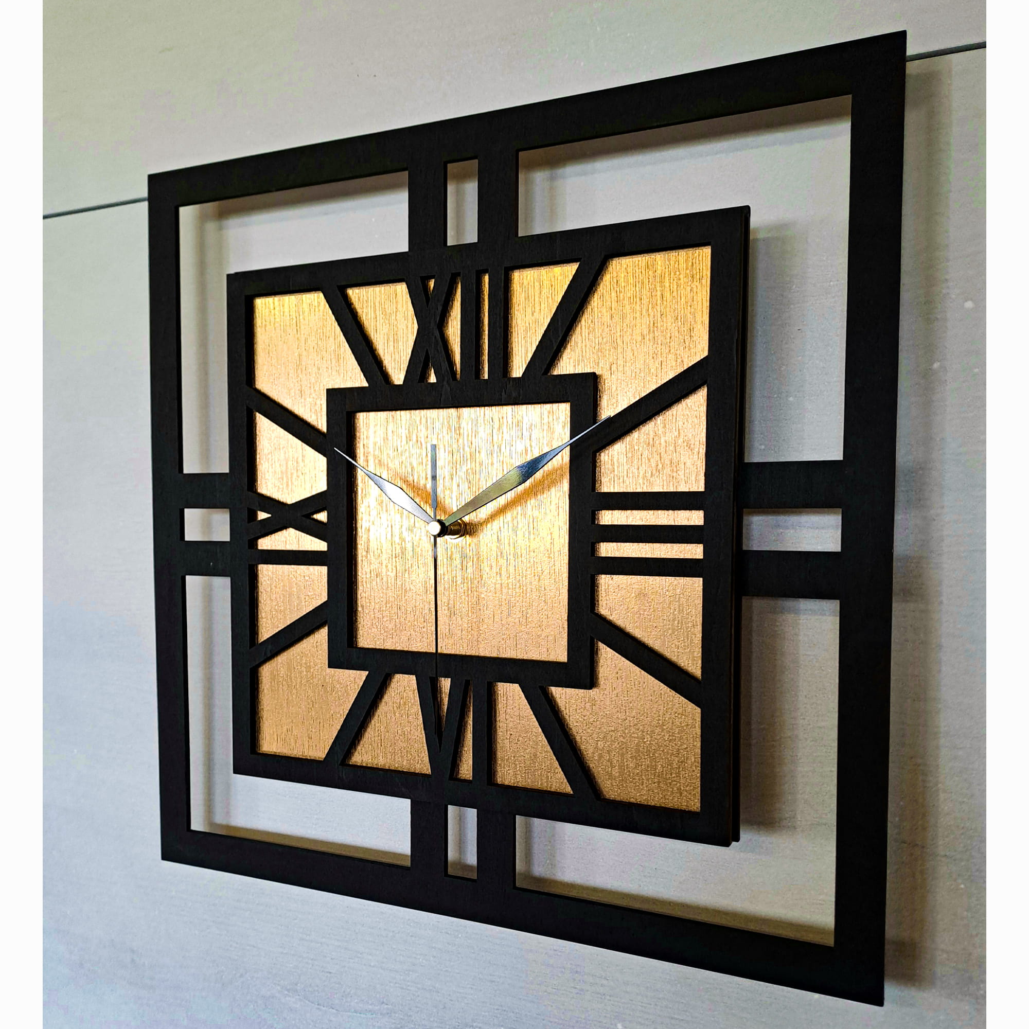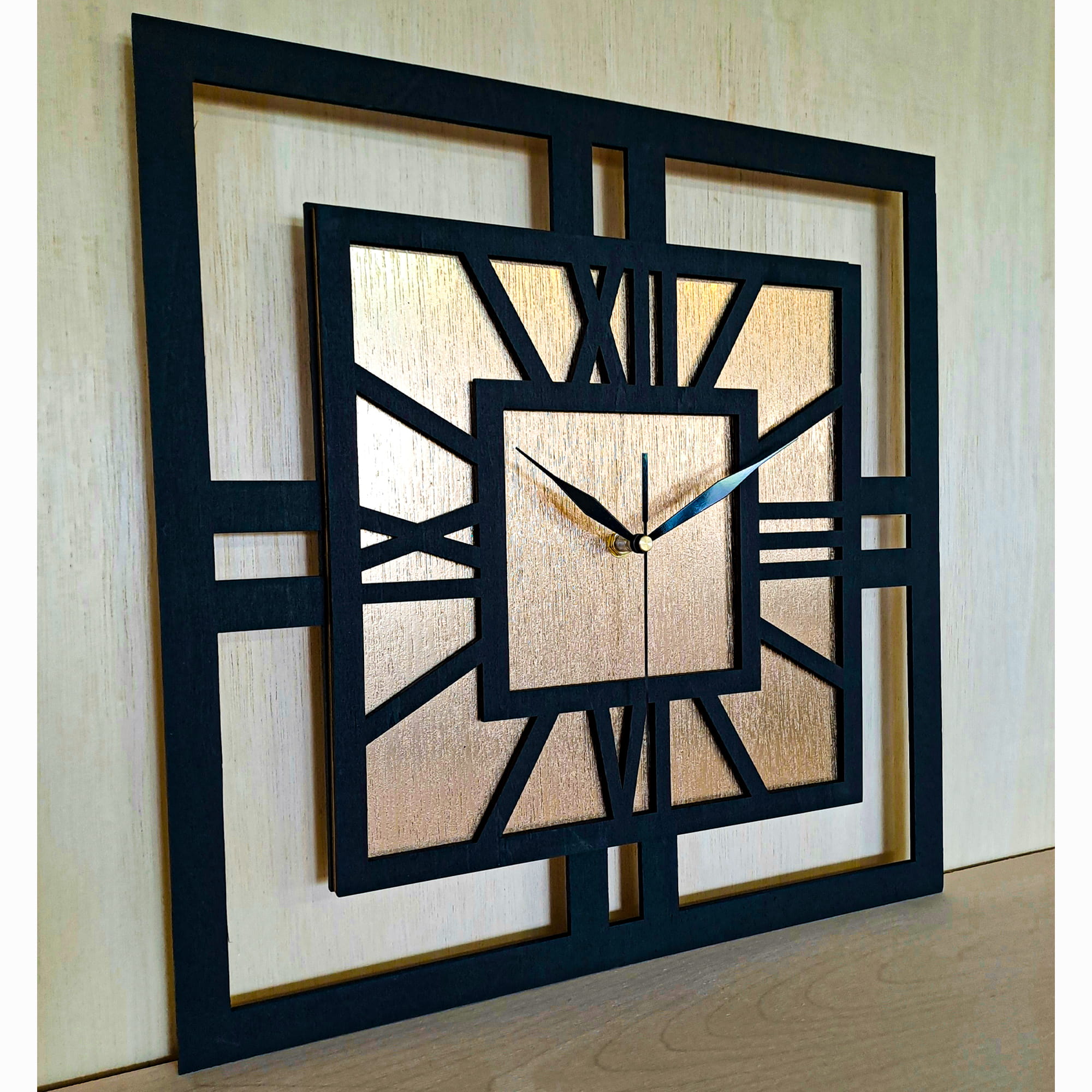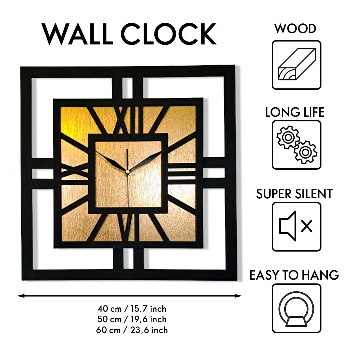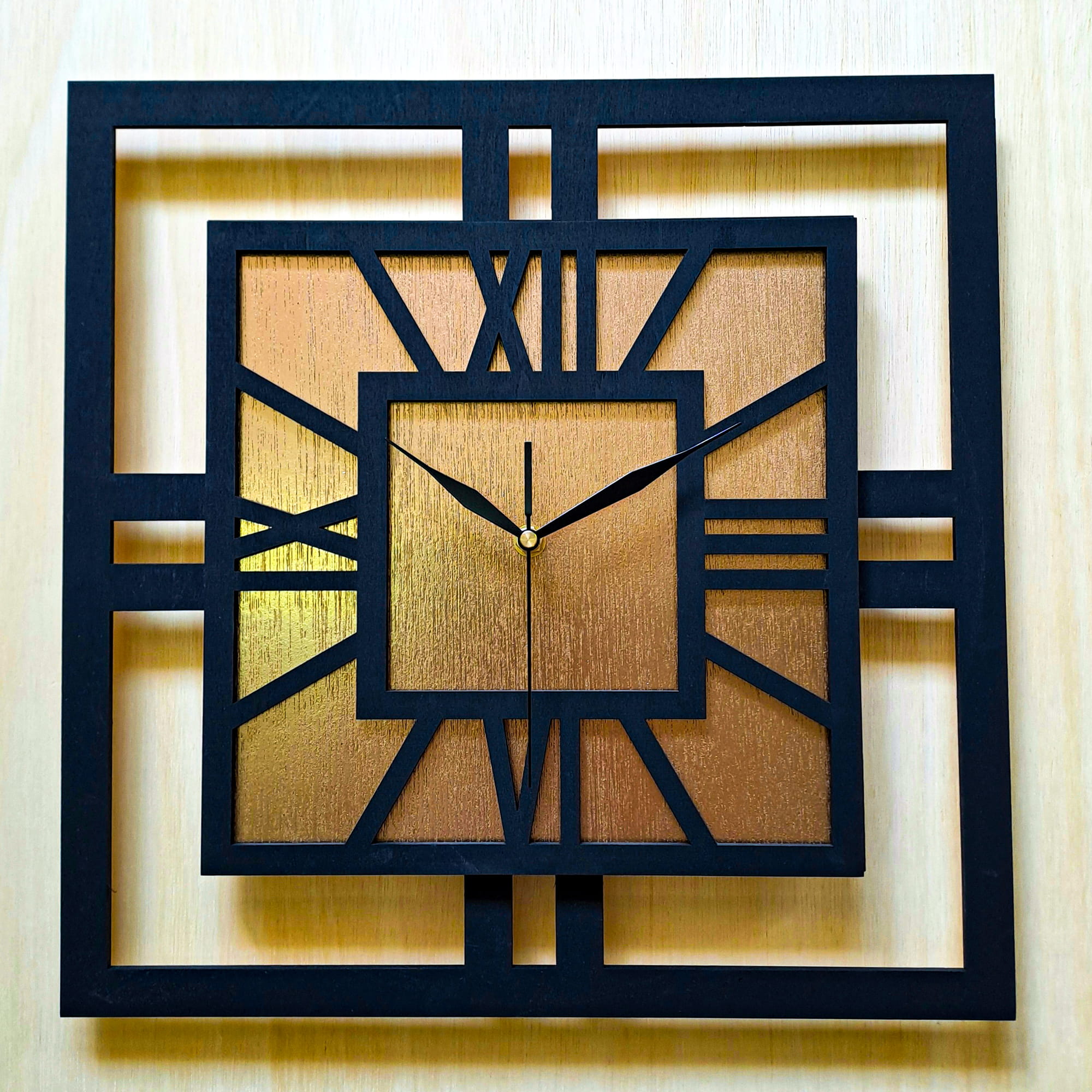 DEKORACYJNY DREWNIANY ZEGAR, NOWOCZESNY, LOFT, STYL INDUSTRIALNY, KWADRAT, DREWNO,MINIMALISTYCZNY, ZŁOTY, 3 ROZMIARY