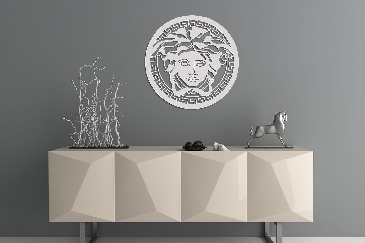 Dekoracyjna grafika ażurowa z motywem Meduzy - najmłodszej z trzech Gorgon. Od 40 lat w logotypie ikony stylu - włoskiego domu mody Versace.