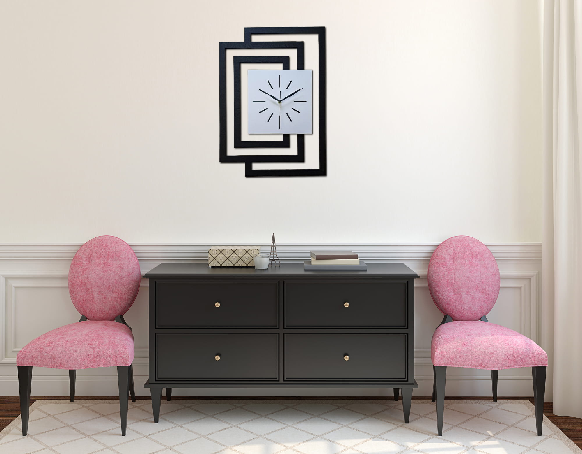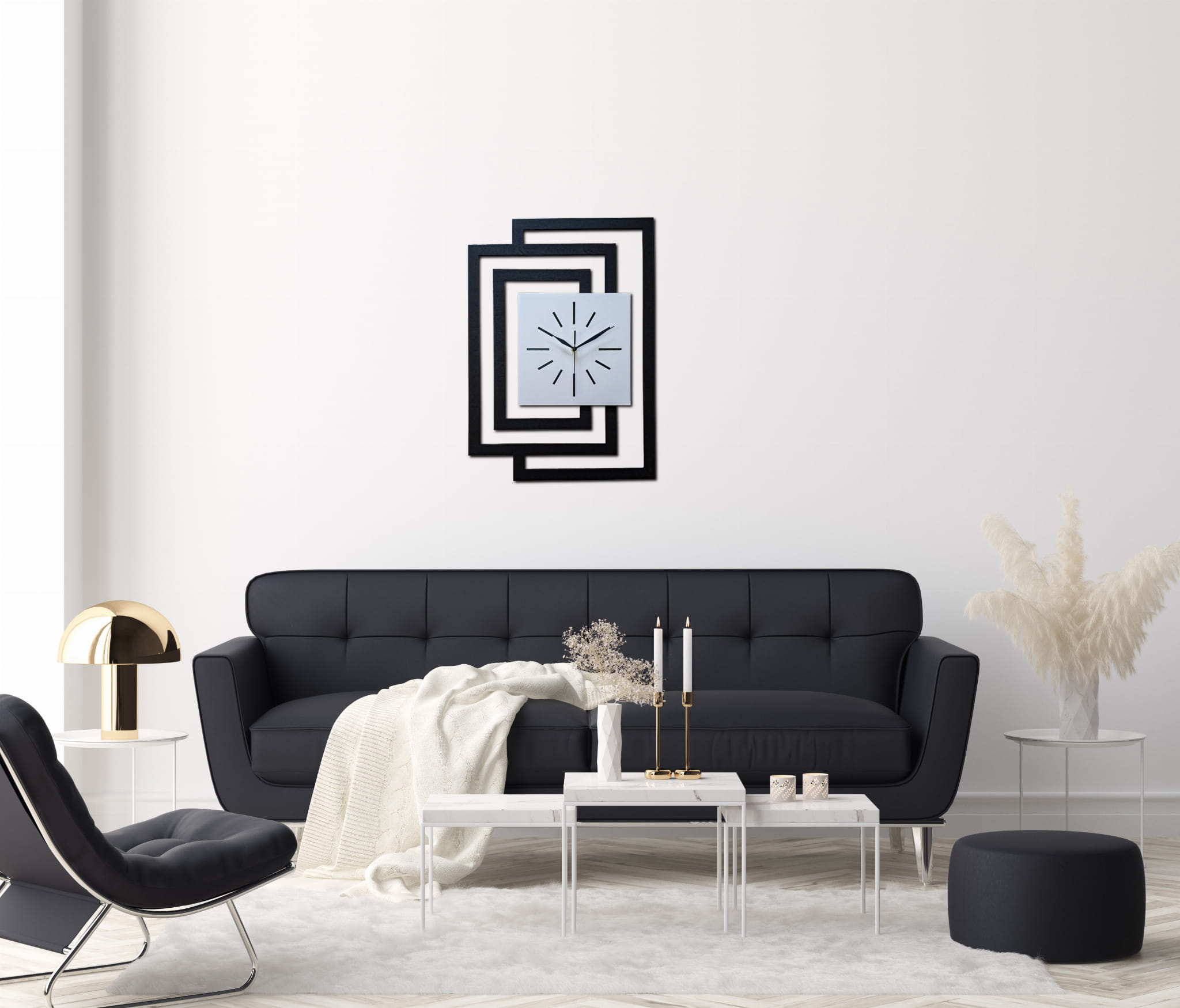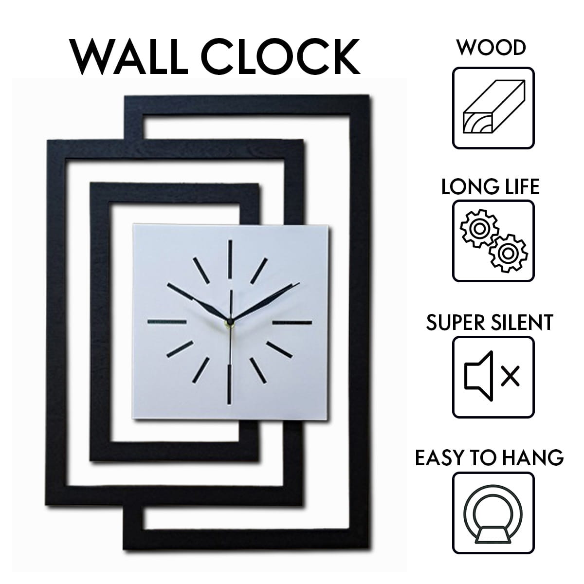 DUŻY, DEKORACYJNY, NOWOCZESNY ZEGAR ŚCIENNY,GEOMETRYCZNY, DO SALONU, MINIMALISTYCZNY, LOFT, HANDMADE, DREWNIANY,CZARNY/ BIAŁY, 43 x 60 cm, CICHY
