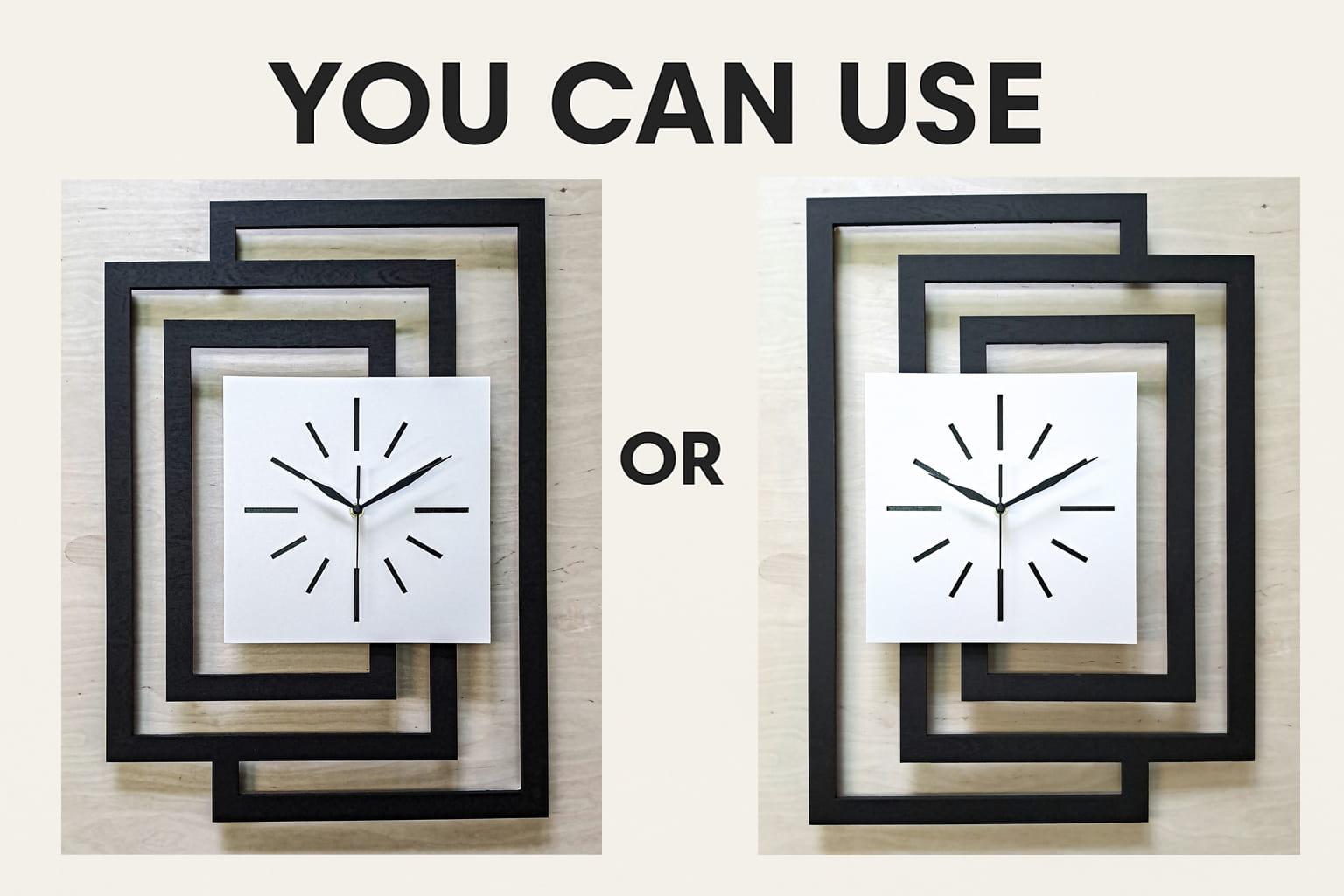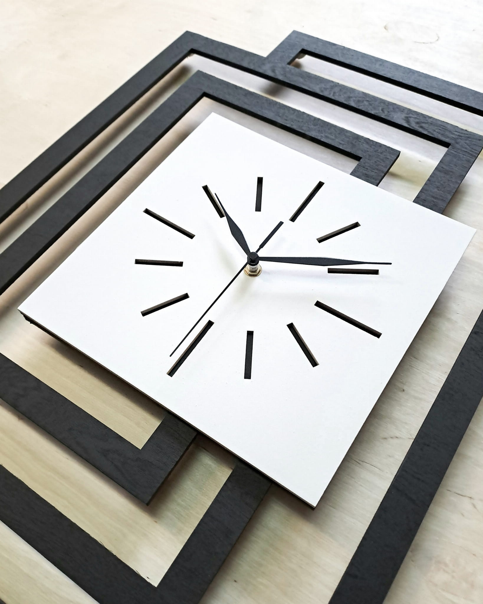 GRUBOŚĆ MATERIAŁU z którego wykonujemy ramę zegara - 5 mm bo tylko w takiej grubości możliwe jest precyzyjne cięcie laserowe , grubość całego zegara 3 cm ( 3 warstwy sklejki 5 mm + mechanizm 15 mm )