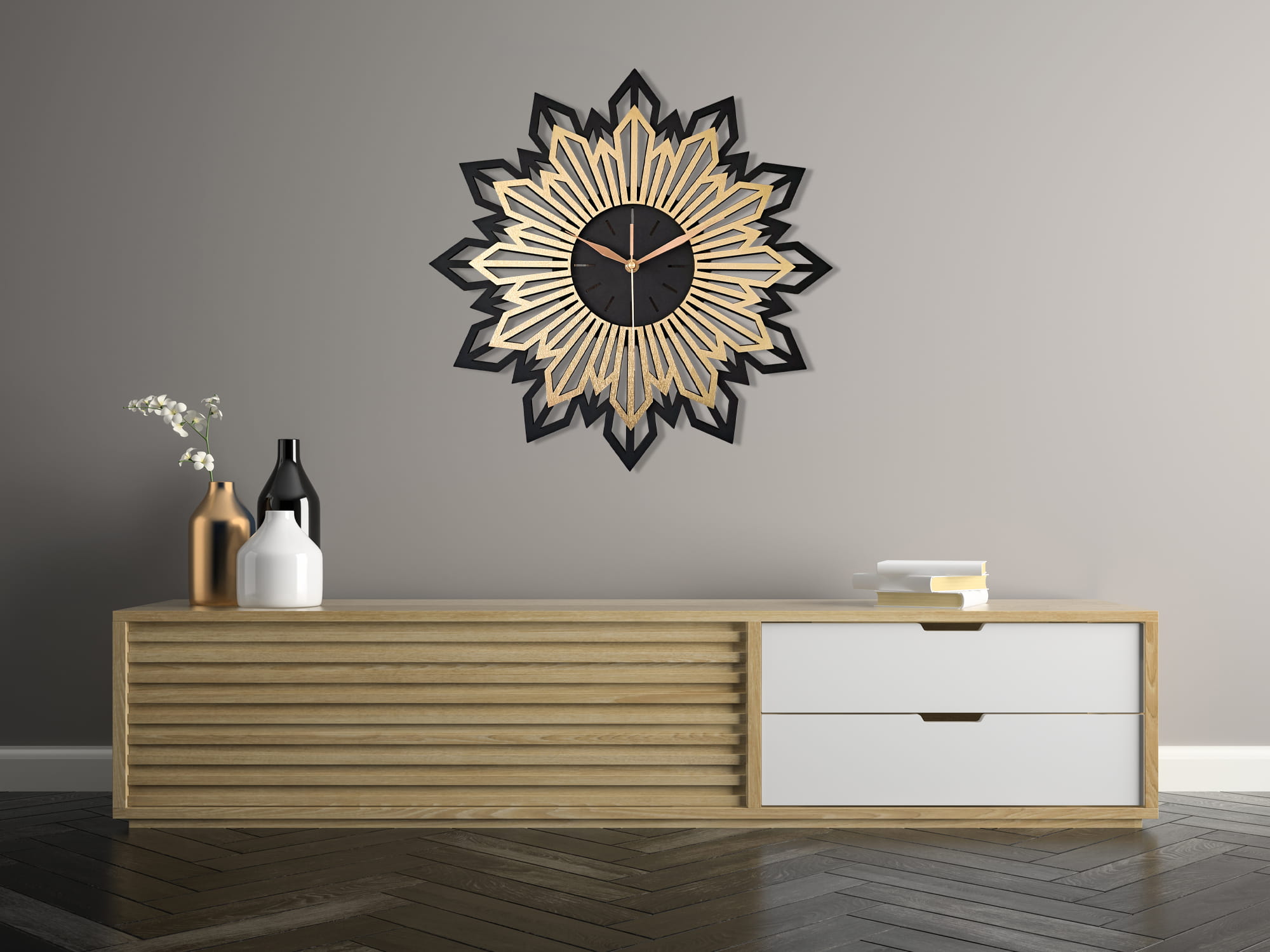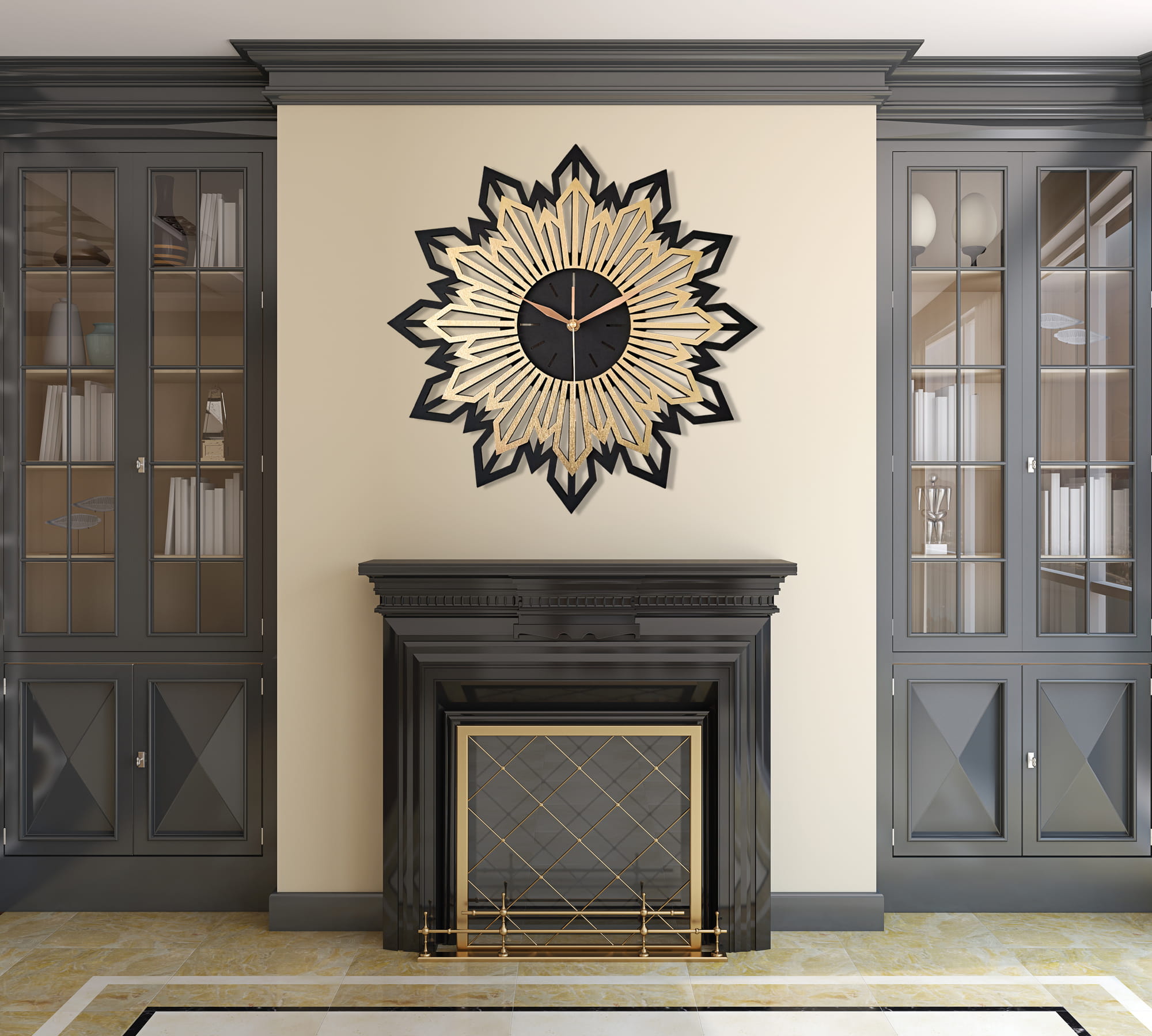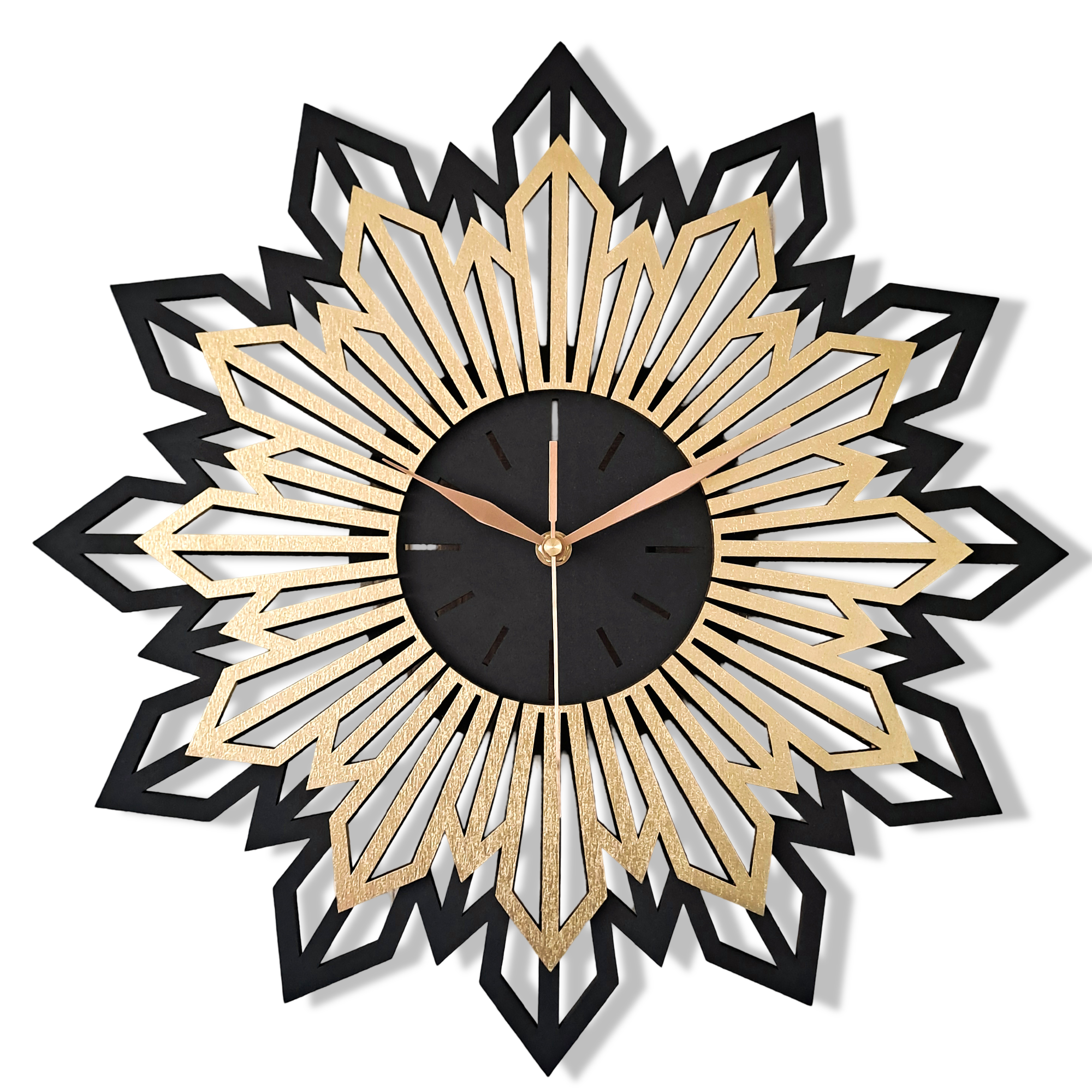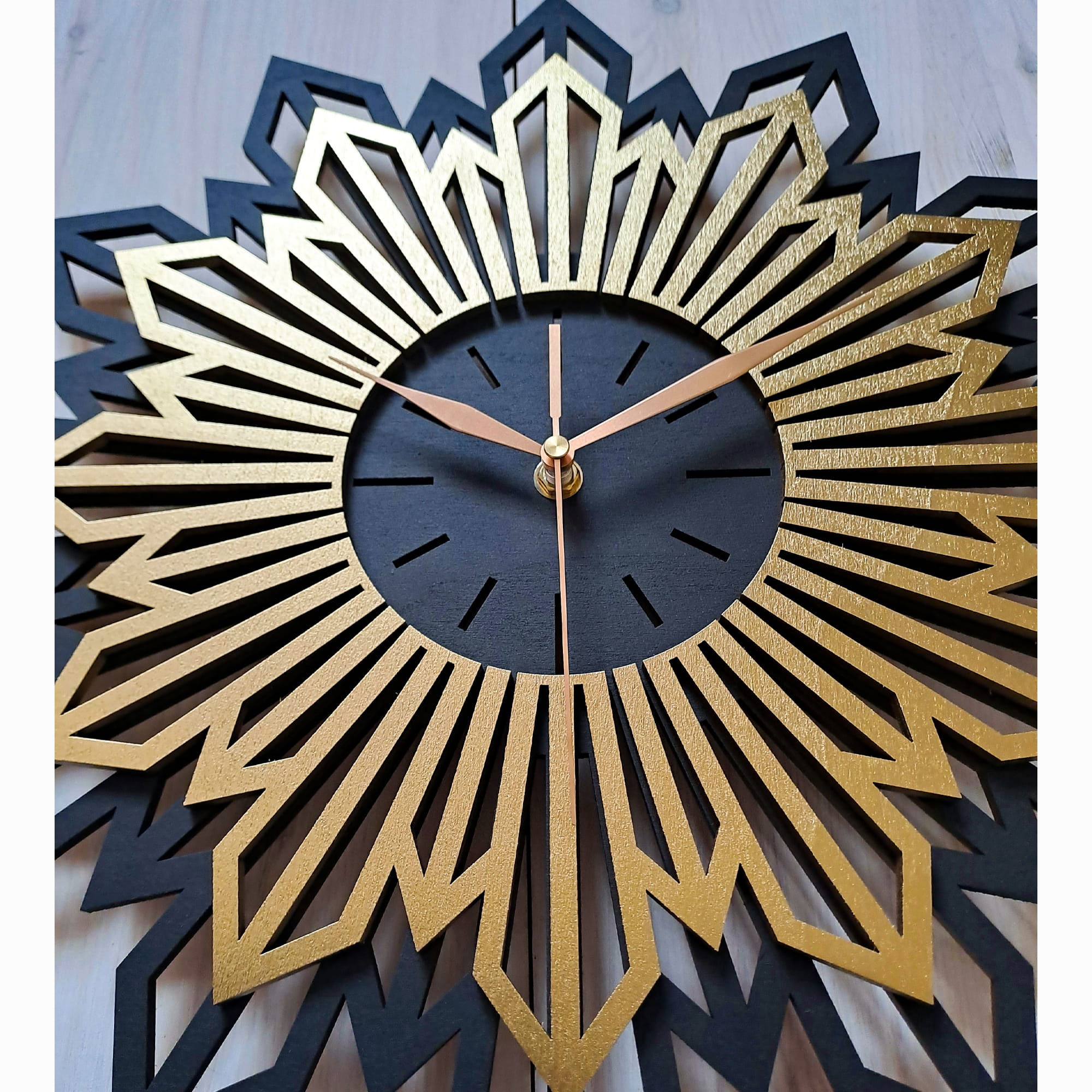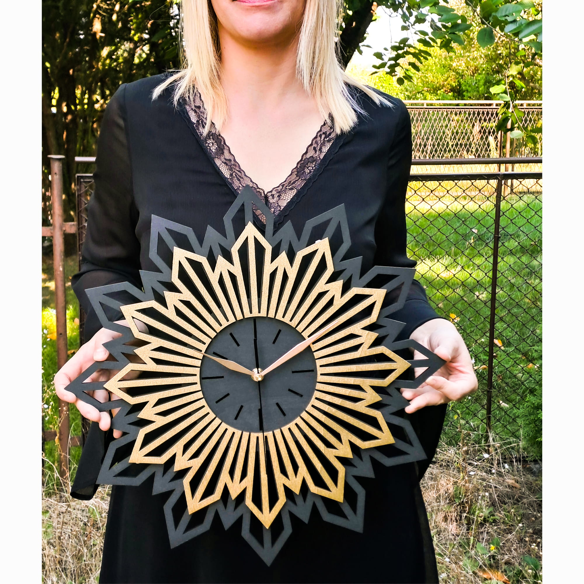 DUŻY, DEKORACYJNY ZEGAR GLAMOUR, CZARNO - ZŁOTY SŁOŃCE, SUNBURST, 3 ROZMIARY