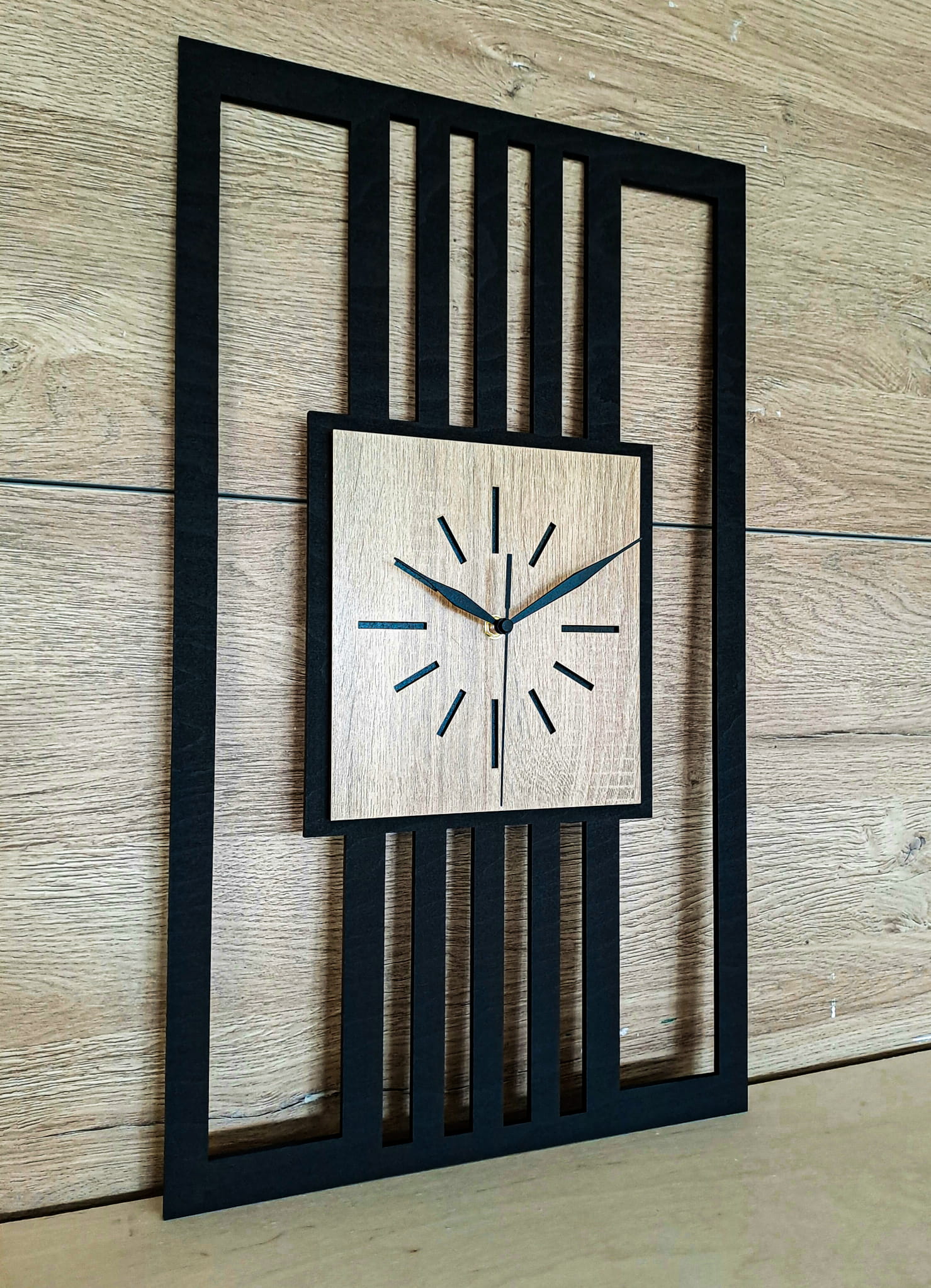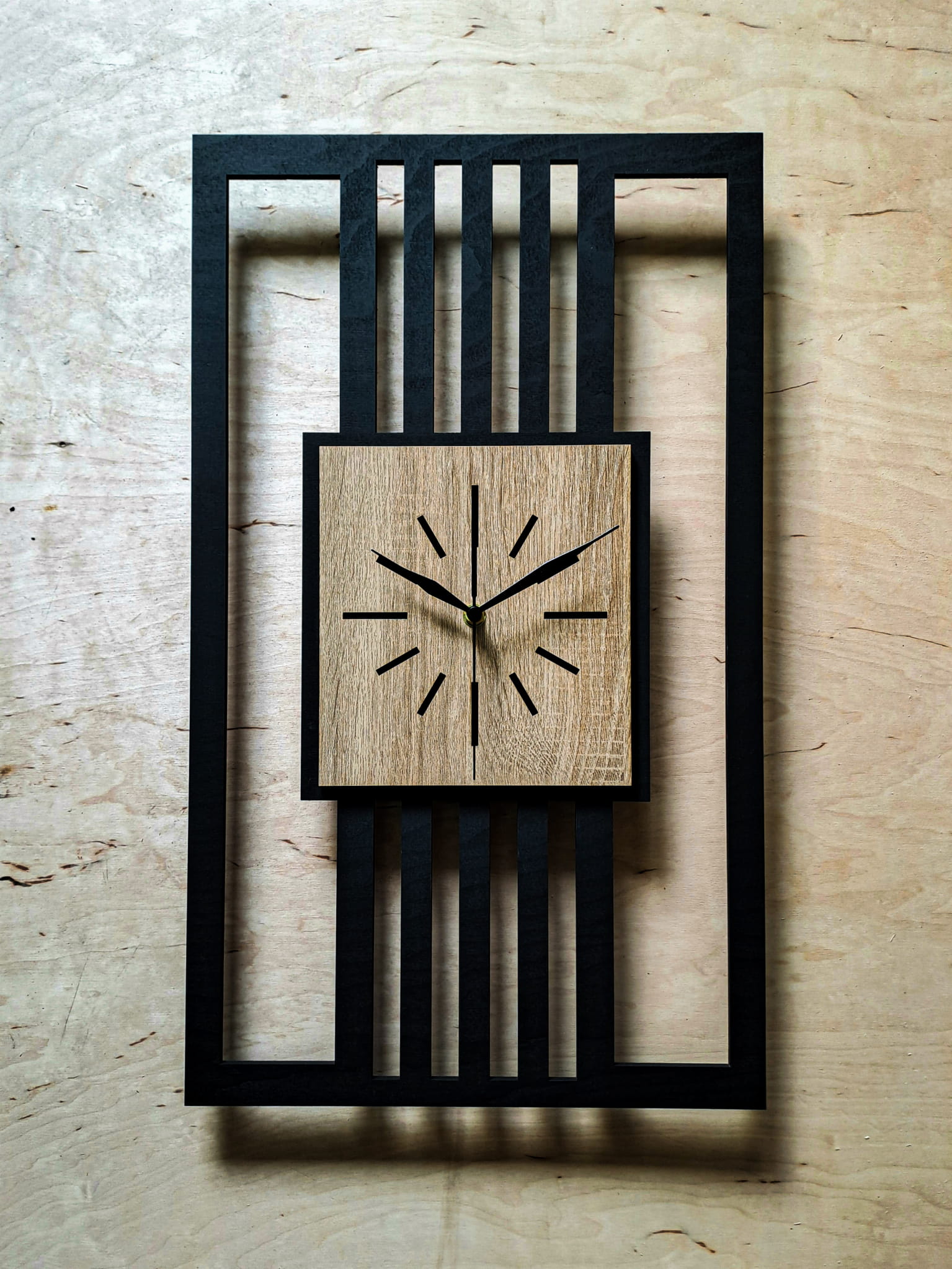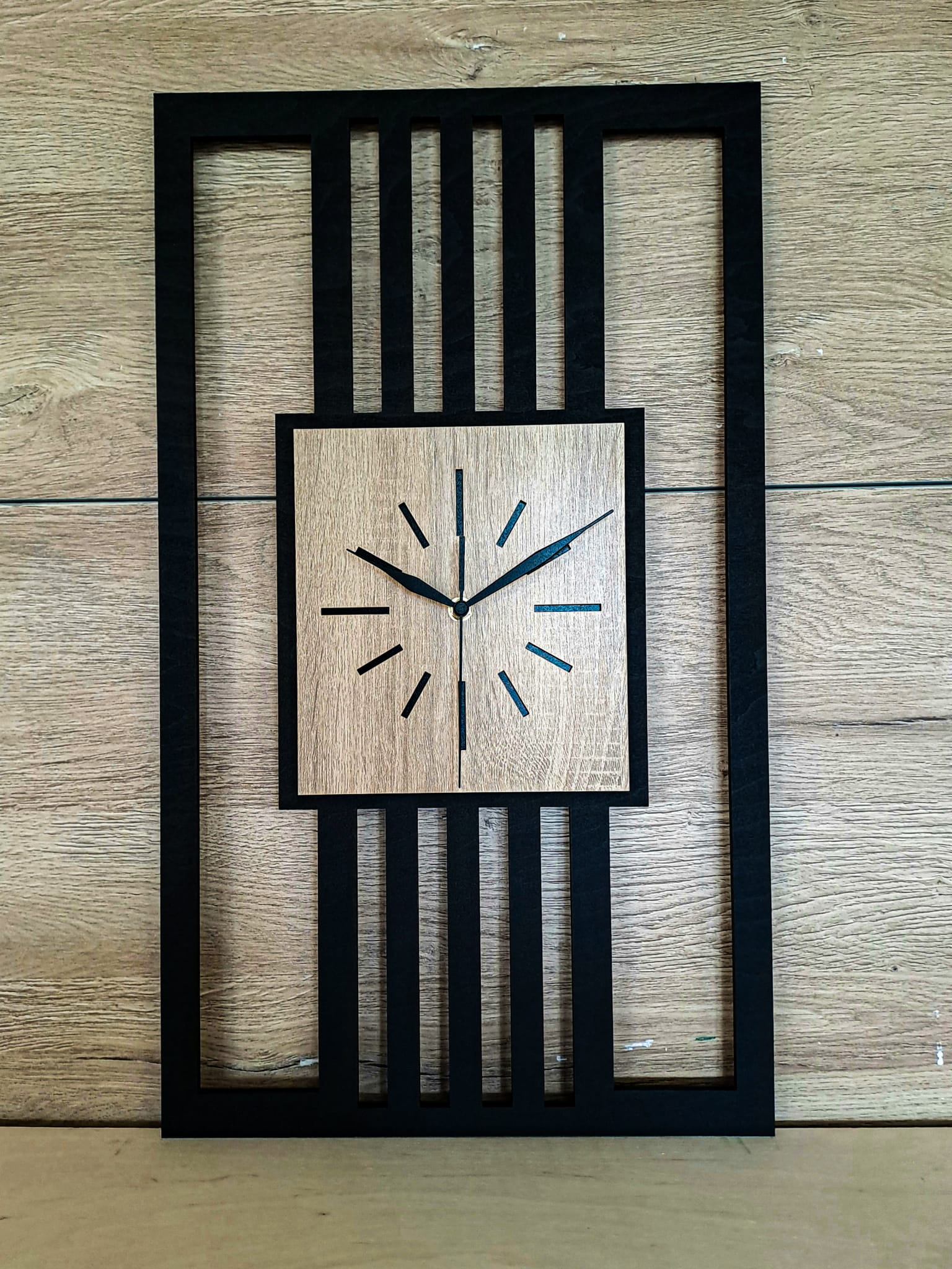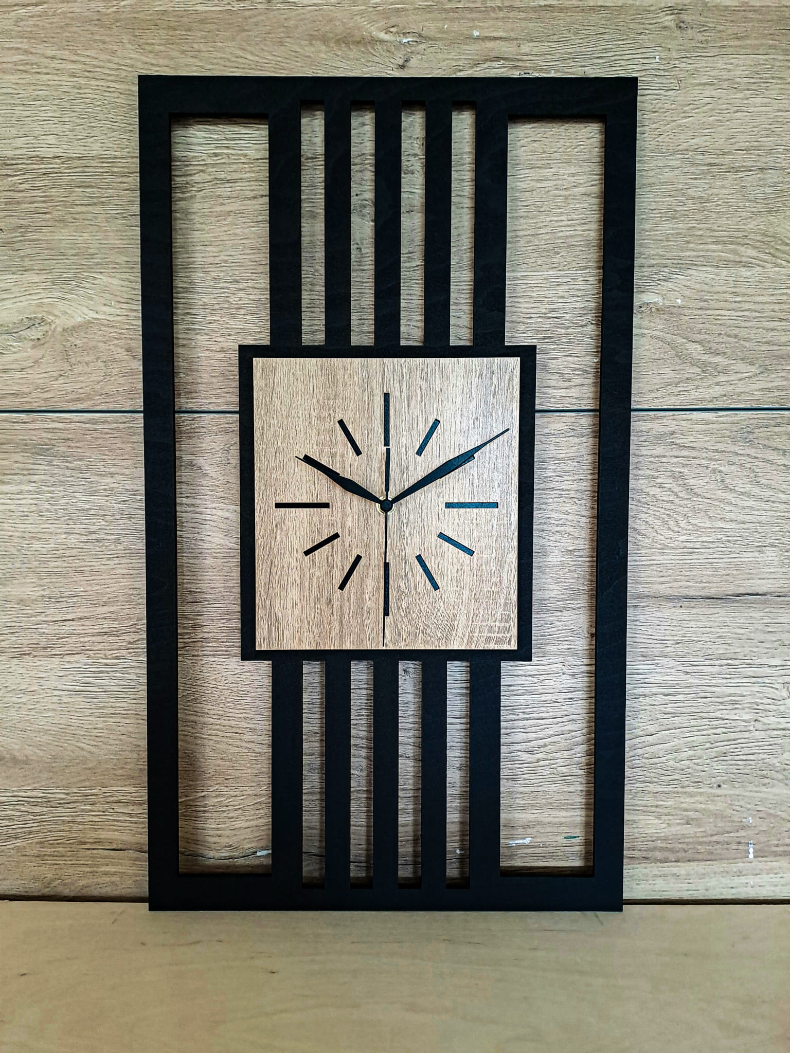 DUŻY, MINIMALISTYCZNY, NOWOCZESNY ZEGAR ŚCIENNY, LAMELE, INDUSTRIALNY, GEOMETRYCZNY, DO SALONU, MINIMALISTYCZNY, LOFT, HANDMADE, DREWNIANY, 35 x 60 cm, PIONOWY, CZARNY/ DĄB SONOMA, CICHY