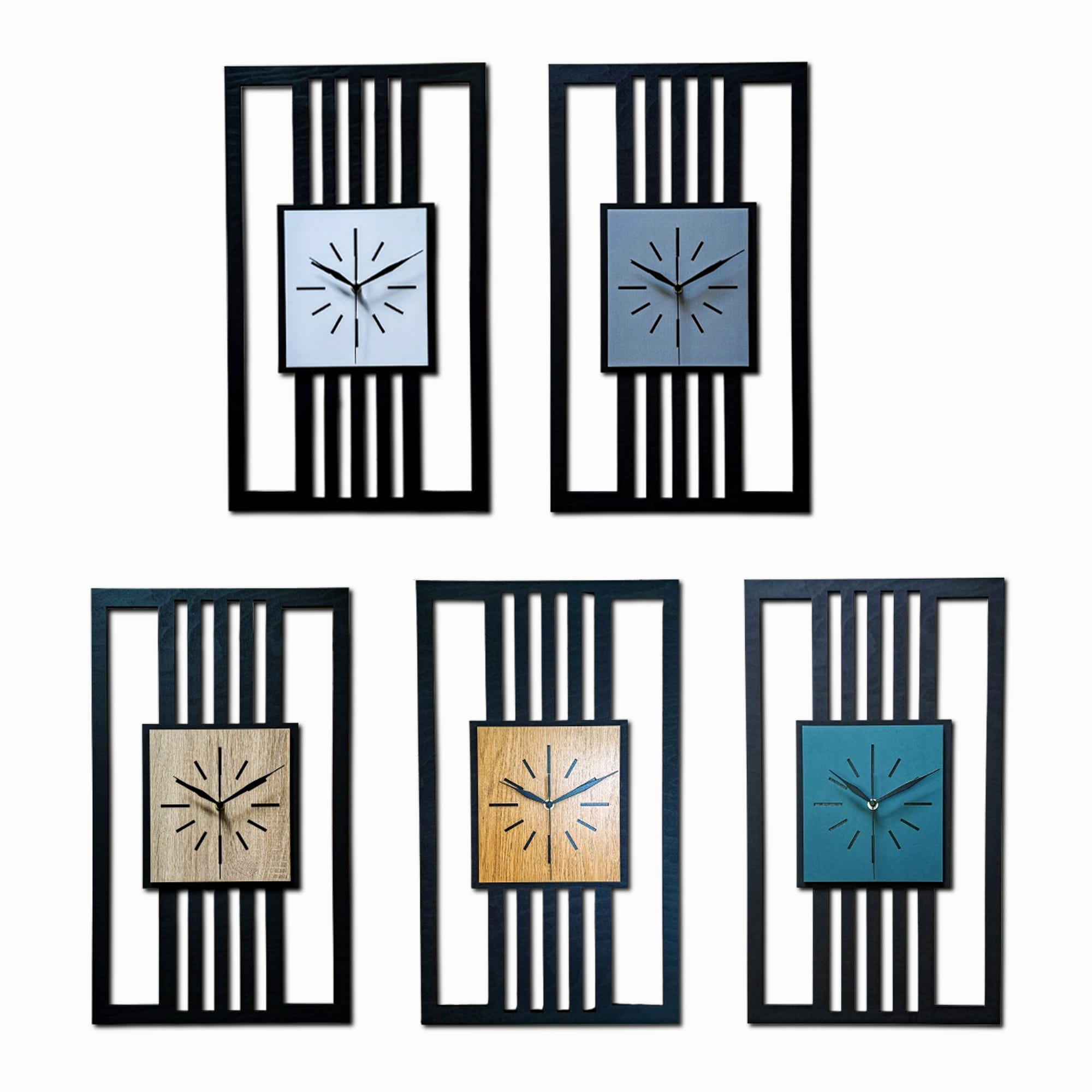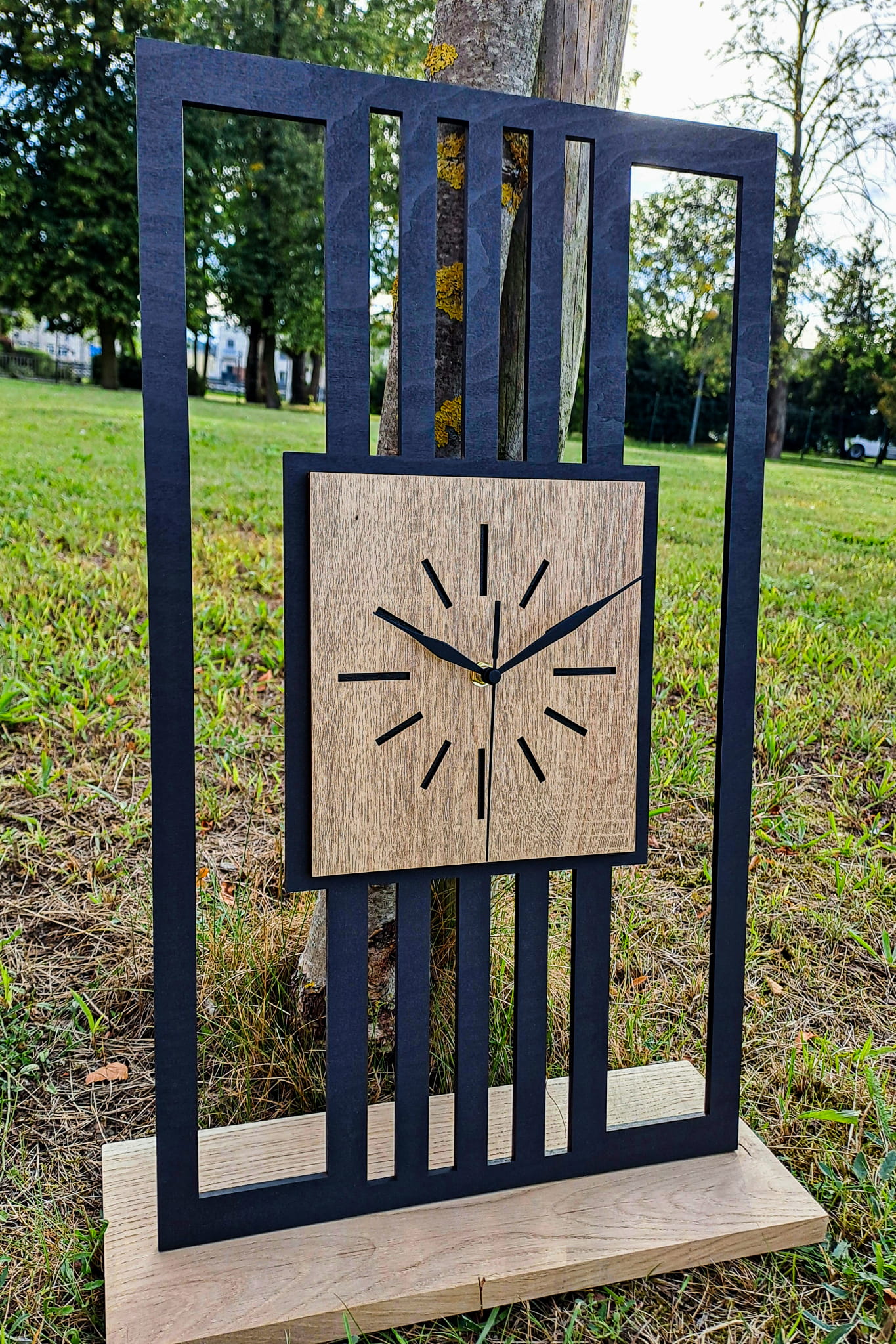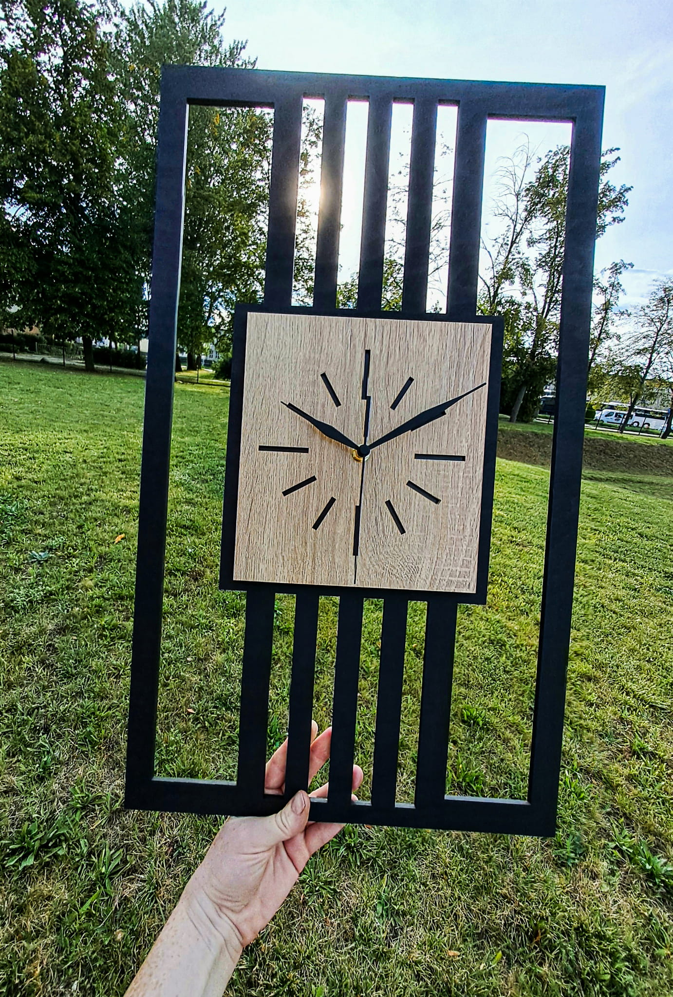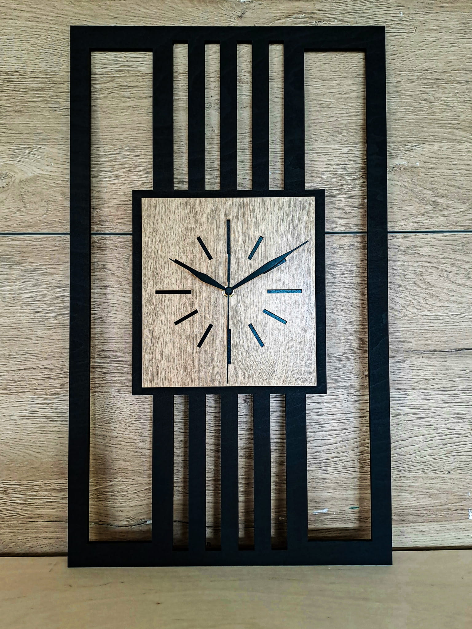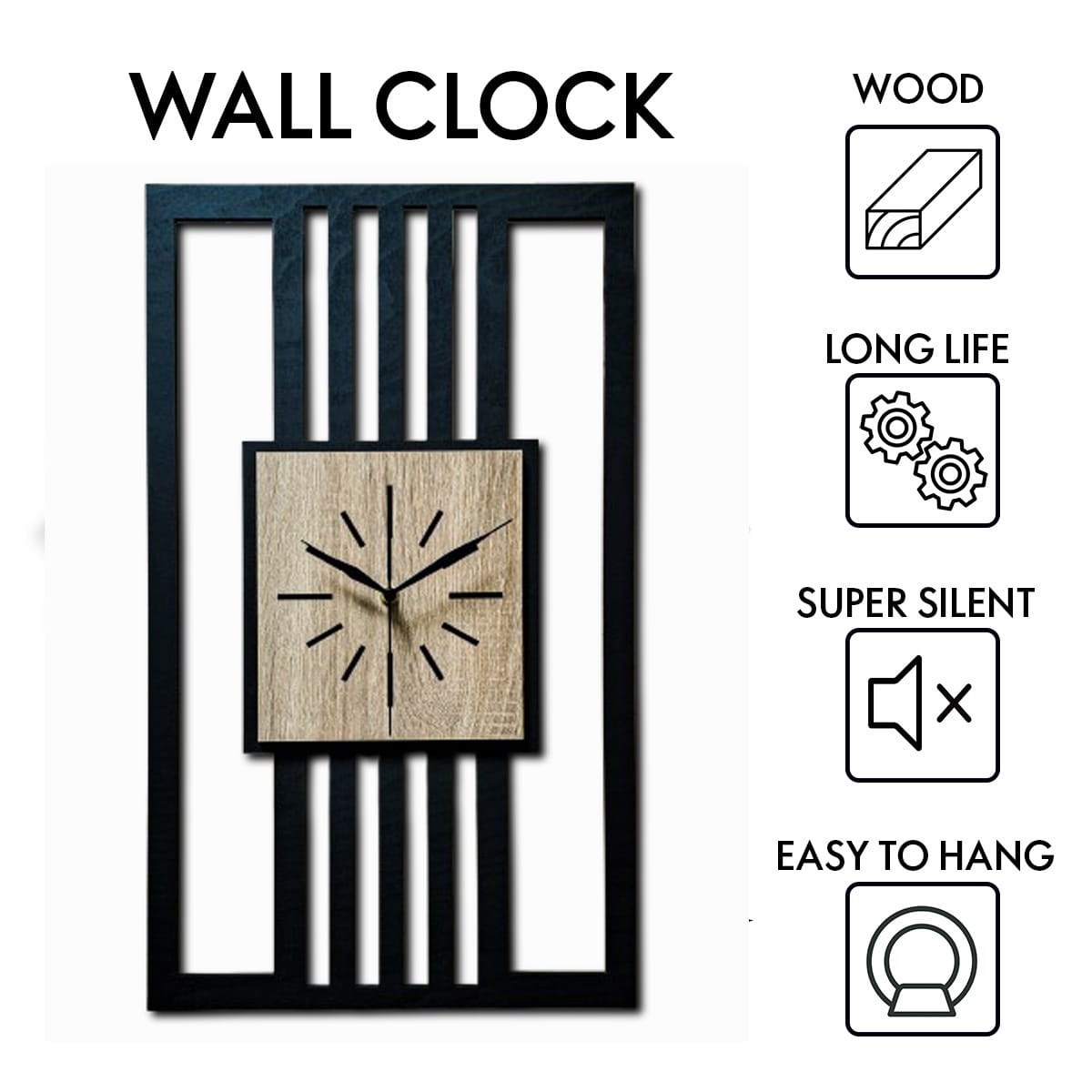 DUŻY, MINIMALISTYCZNY, NOWOCZESNY ZEGAR ŚCIENNY, LAMELE, INDUSTRIALNY, GEOMETRYCZNY, DO SALONU, MINIMALISTYCZNY, LOFT, HANDMADE, DREWNIANY, 35 x 60 cm, PIONOWY, CZARNY/ DĄB SONOMA, CICHY