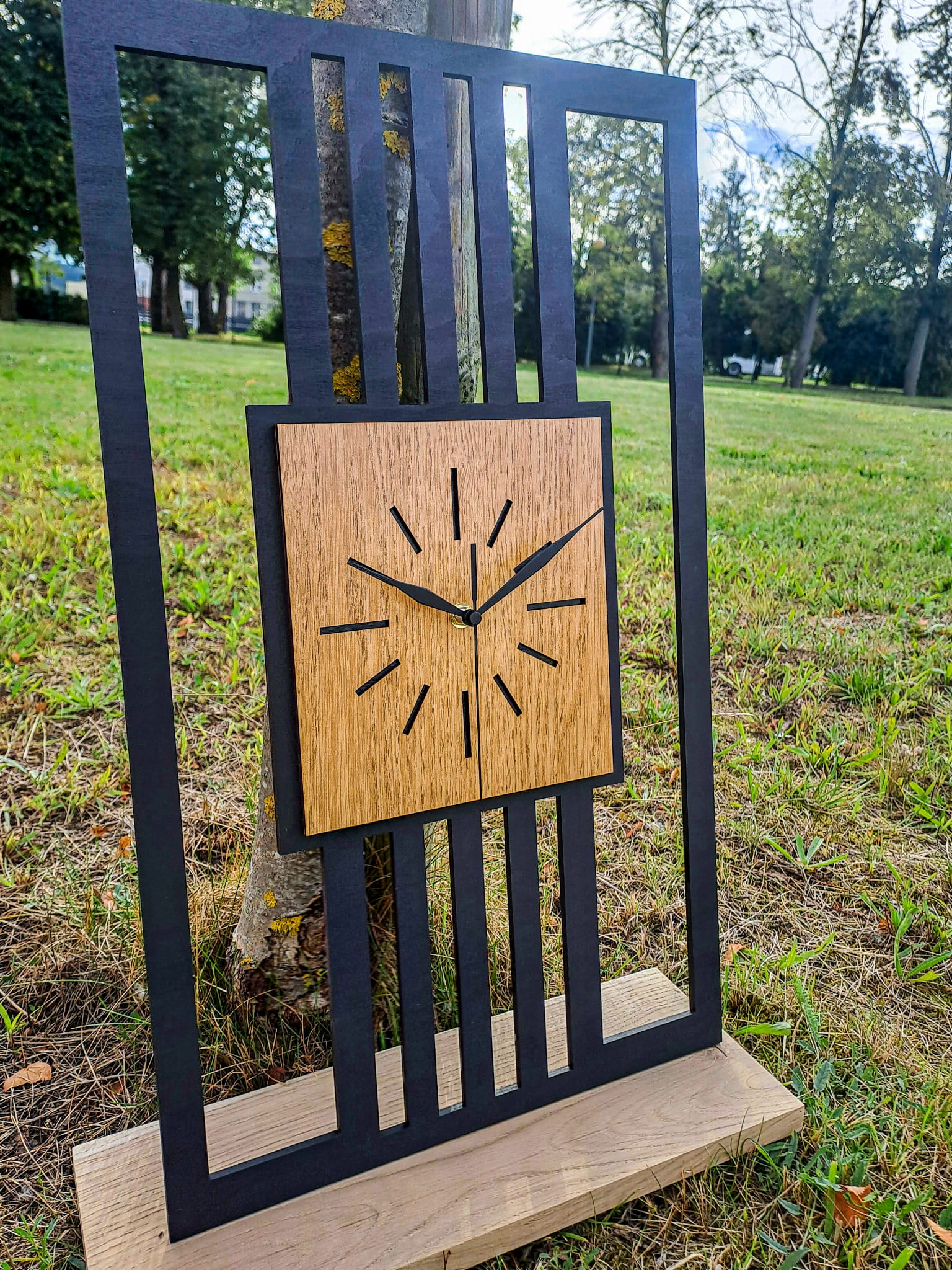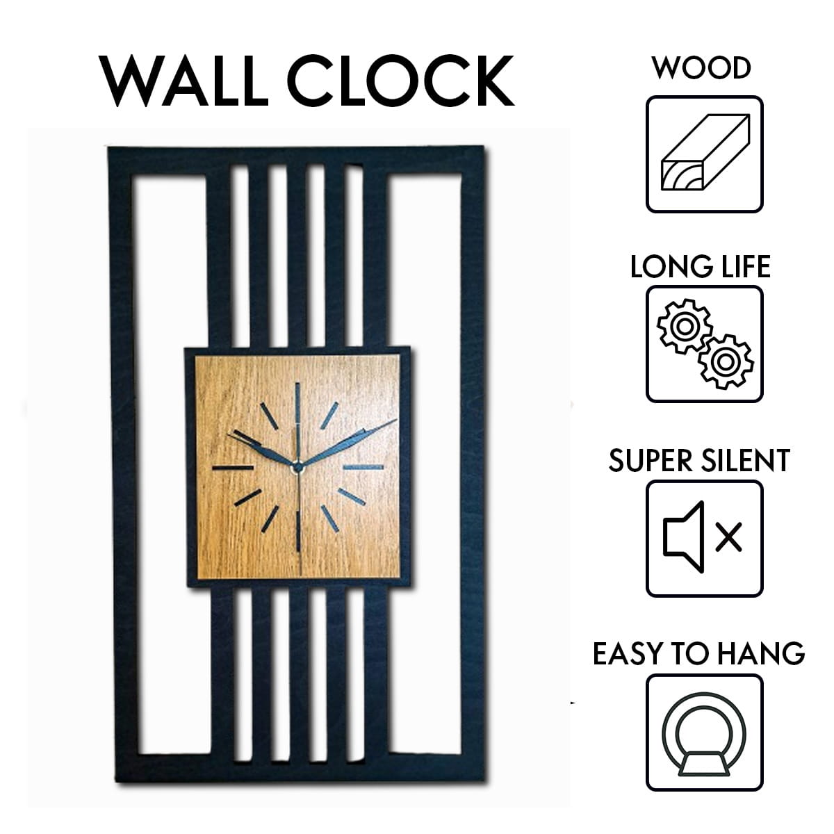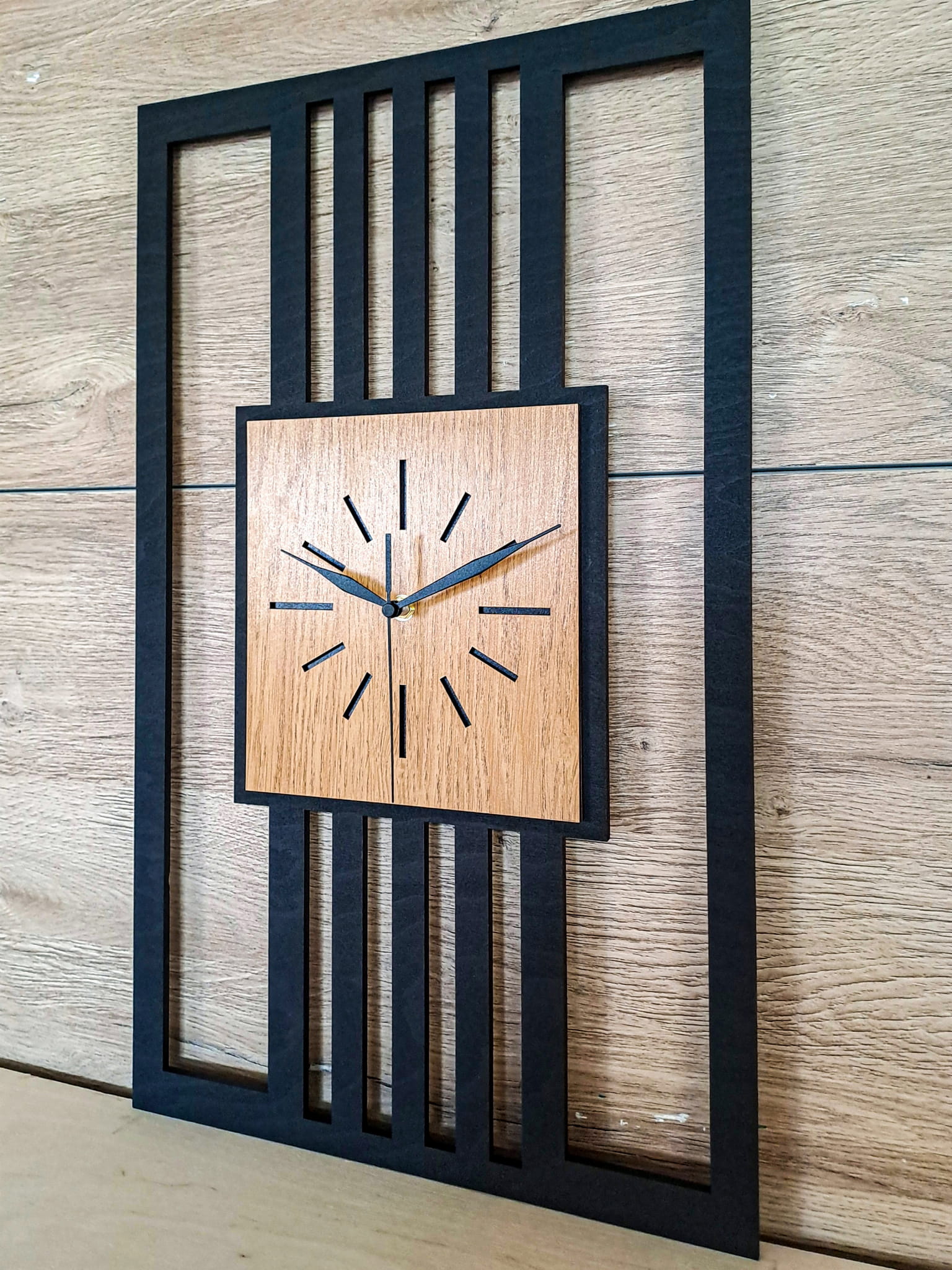 DUŻY, MINIMALISTYCZNY, NOWOCZESNY ZEGAR ŚCIENNY, LAMELE, INDUSTRIALNY, GEOMETRYCZNY, DO SALONU, MINIMALISTYCZNY, LOFT, HANDMADE, DREWNIANY, 35 x 60 cm, PIONOWY, CZARNY/ DĄB ZŁOTY, CICHY