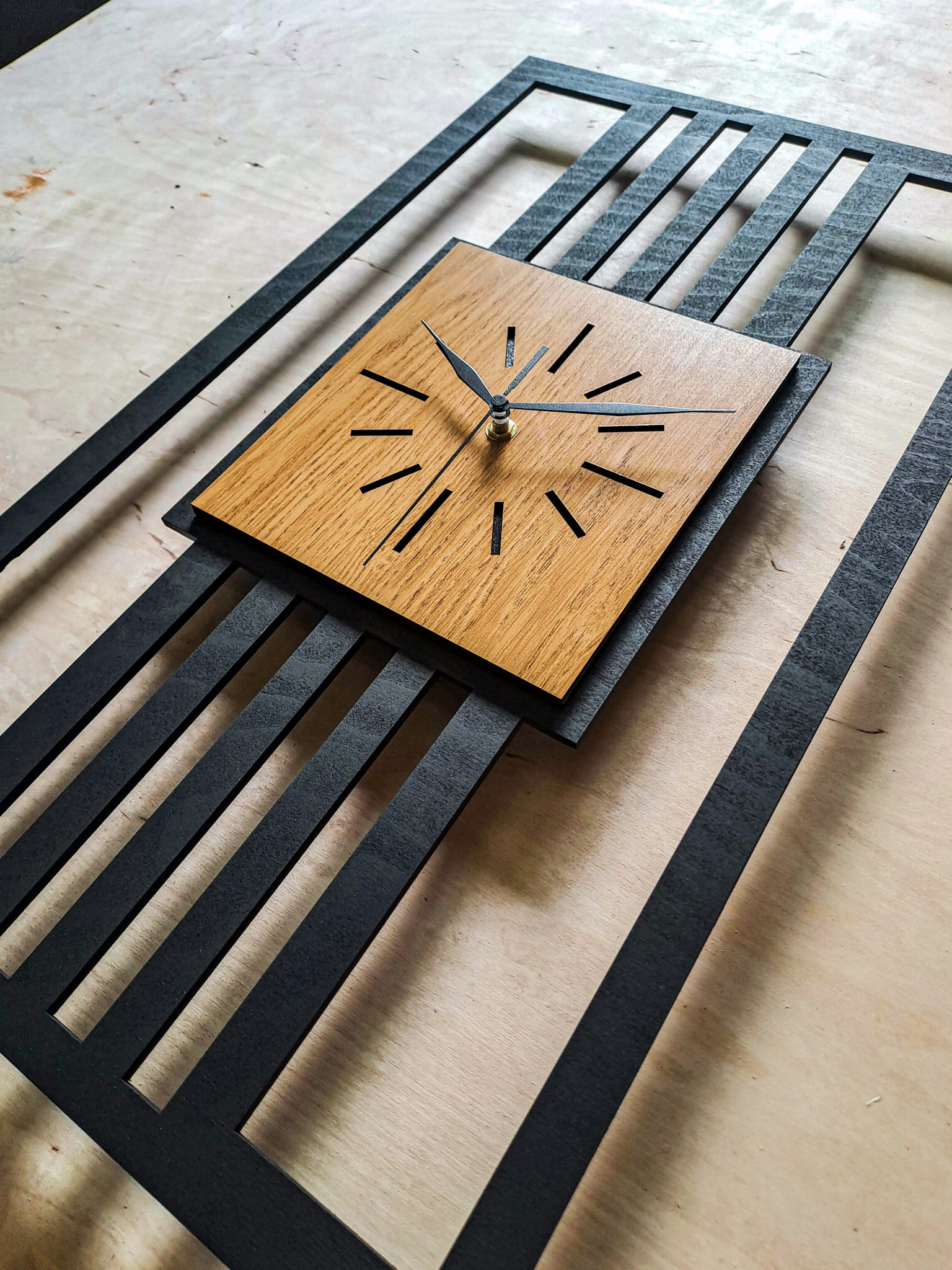 GRUBOŚĆ MATERIAŁU z którego wykonujemy ramę zegara - 5 mm bo tylko w takiej grubości możliwe jest precyzyjne cięcie laserowe , grubość całego zegara 3 cm ( 3 warstwy sklejki 5 mm + mechanizm 15 mm )