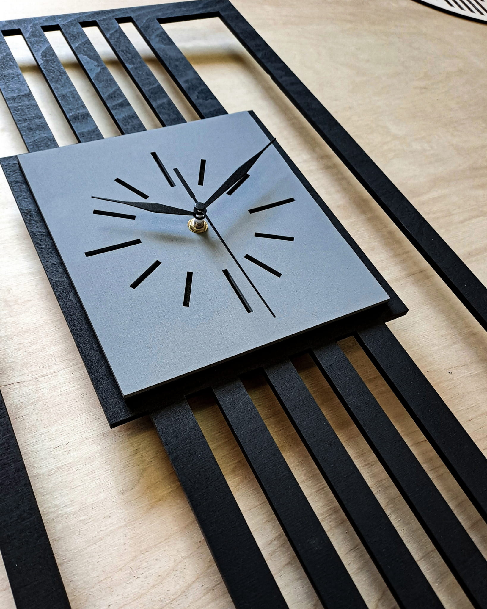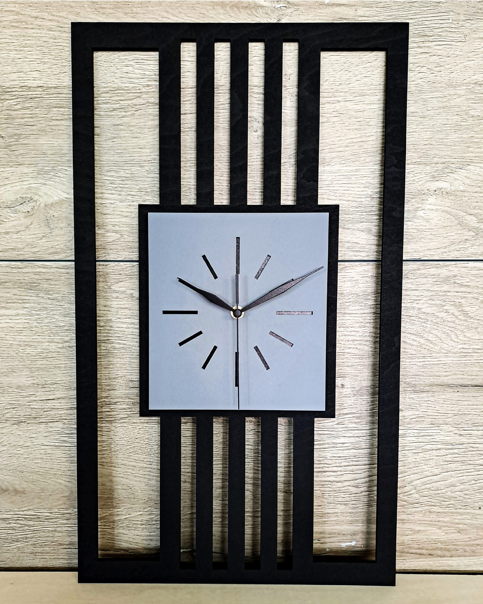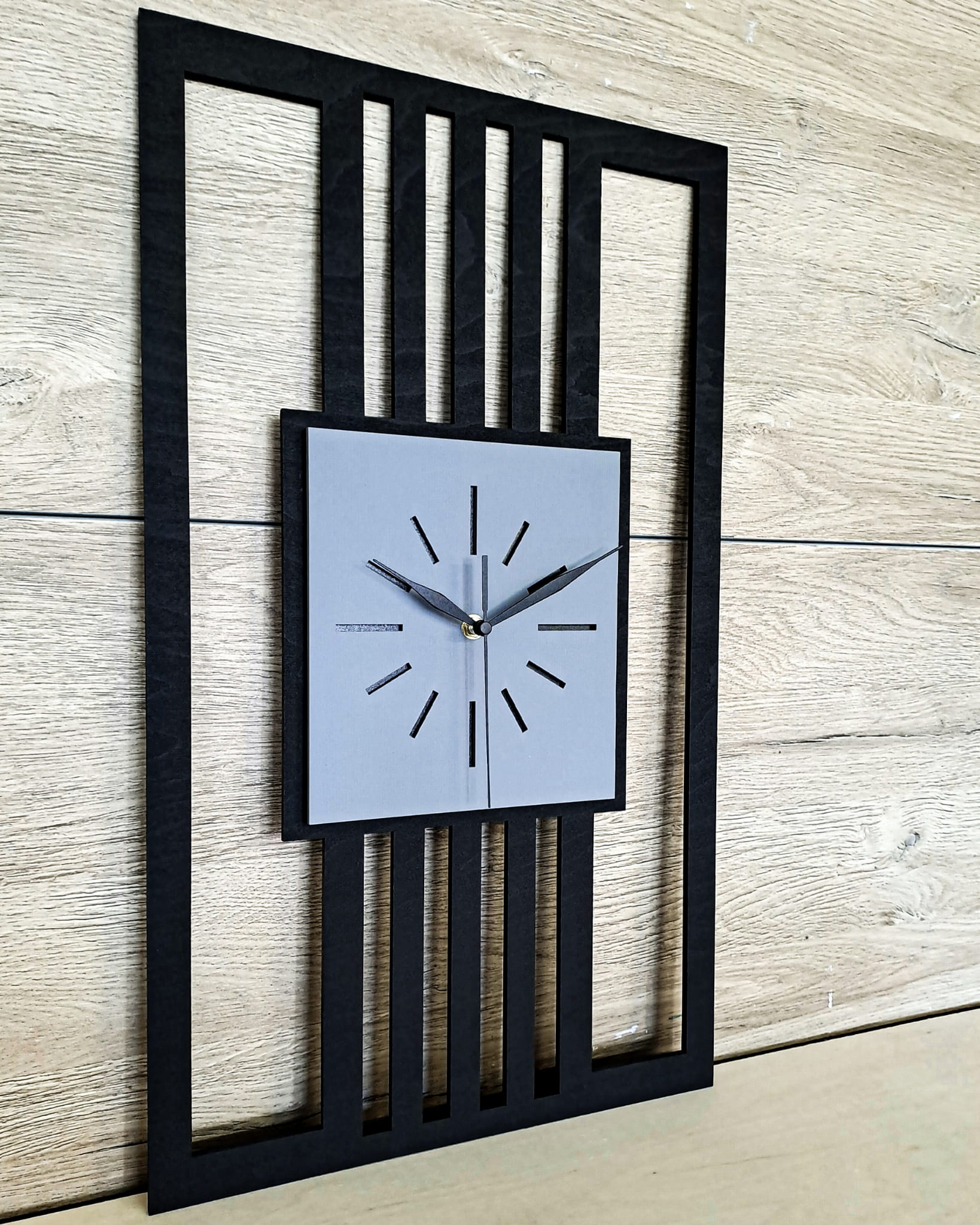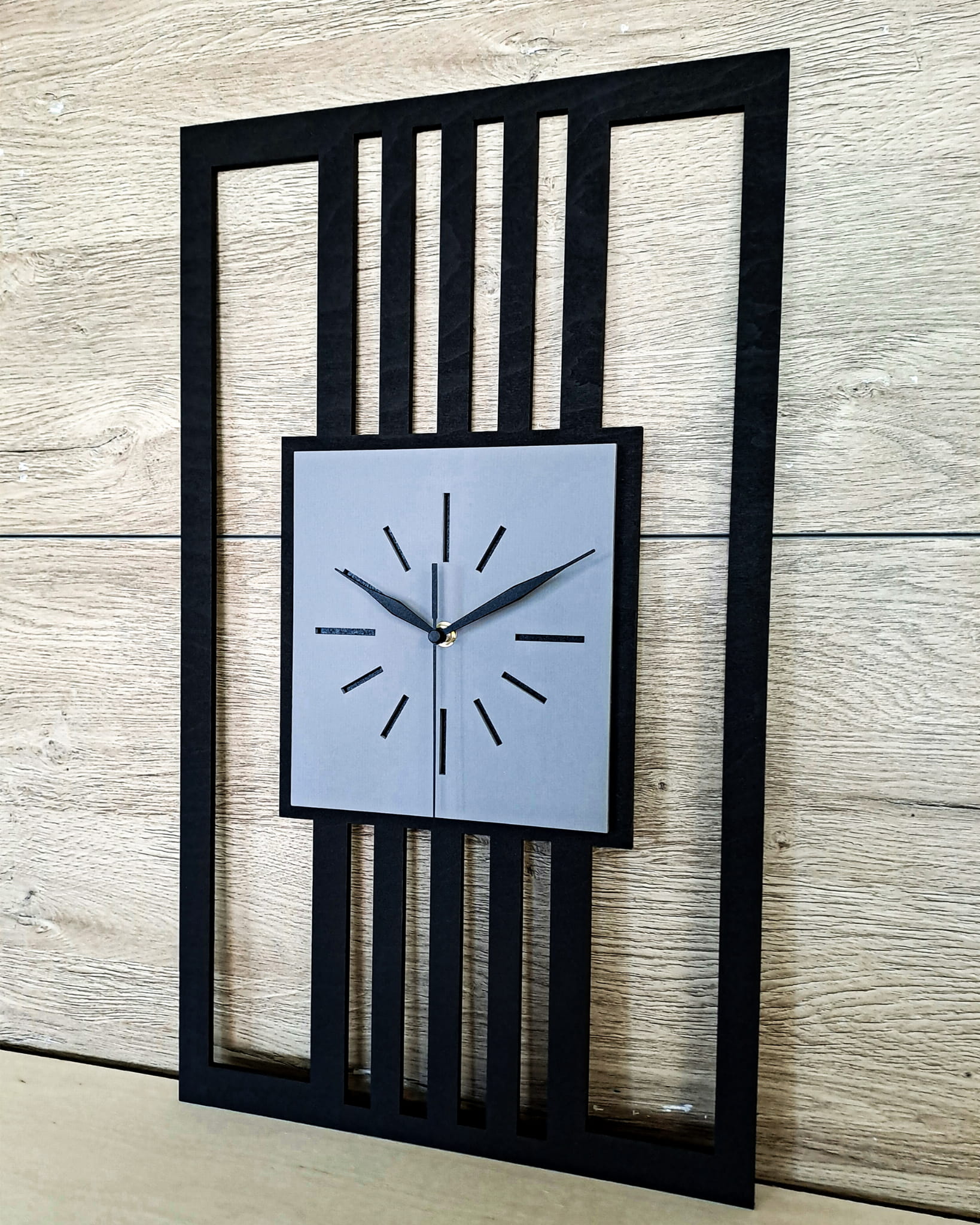 DUŻY, MINIMALISTYCZNY, NOWOCZESNY ZEGAR ŚCIENNY, LAMELE, INDUSTRIALNY, GEOMETRYCZNY, DO SALONU, MINIMALISTYCZNY, LOFT, HANDMADE, DREWNIANY, 35 x 60 cm, PIONOWY, CZARNY/ SZARY, CICHY