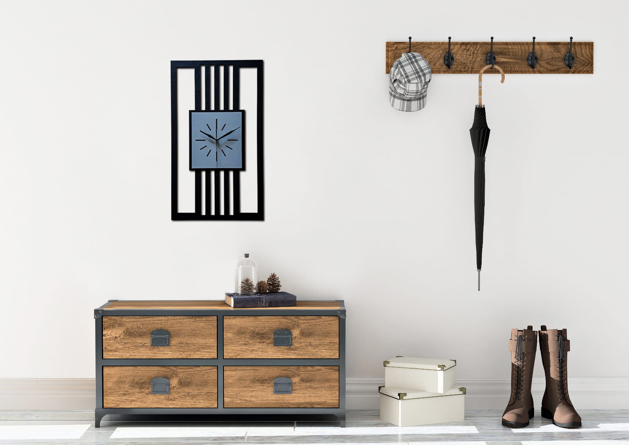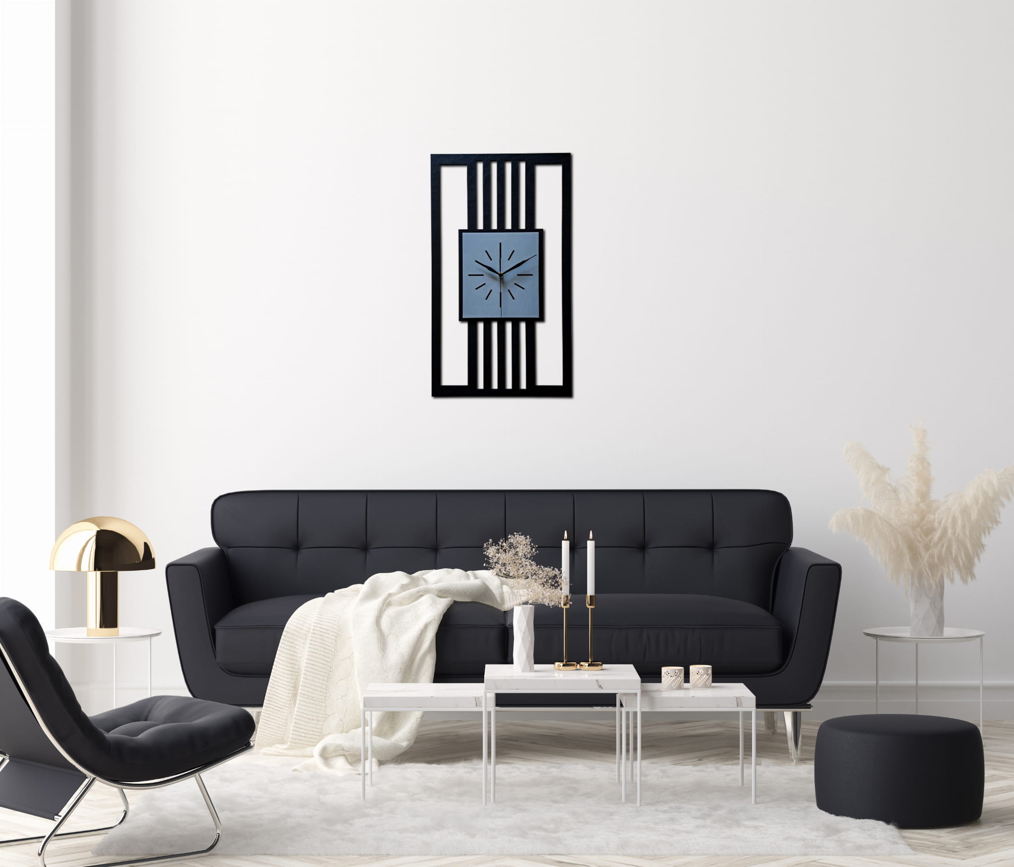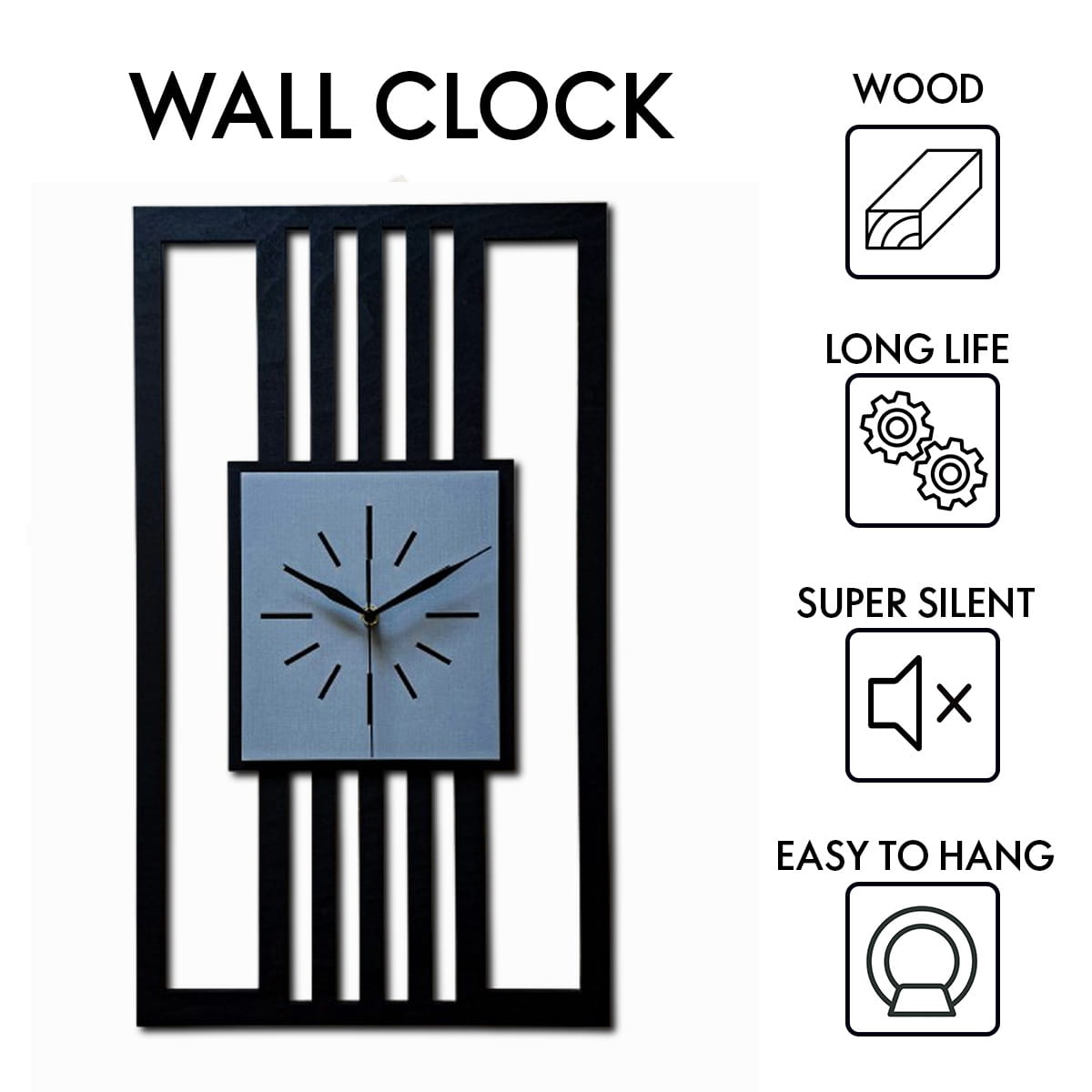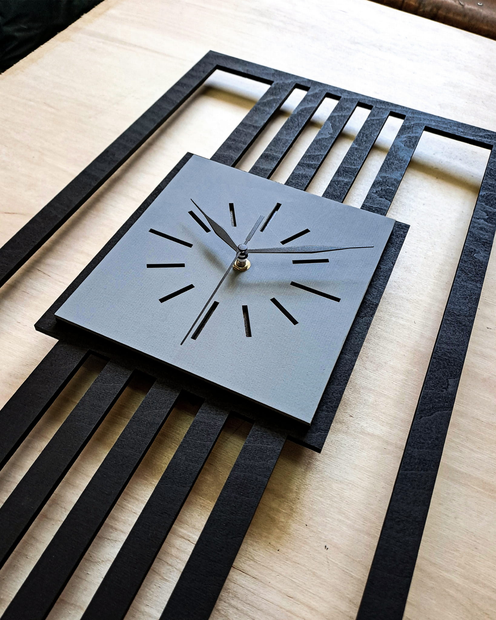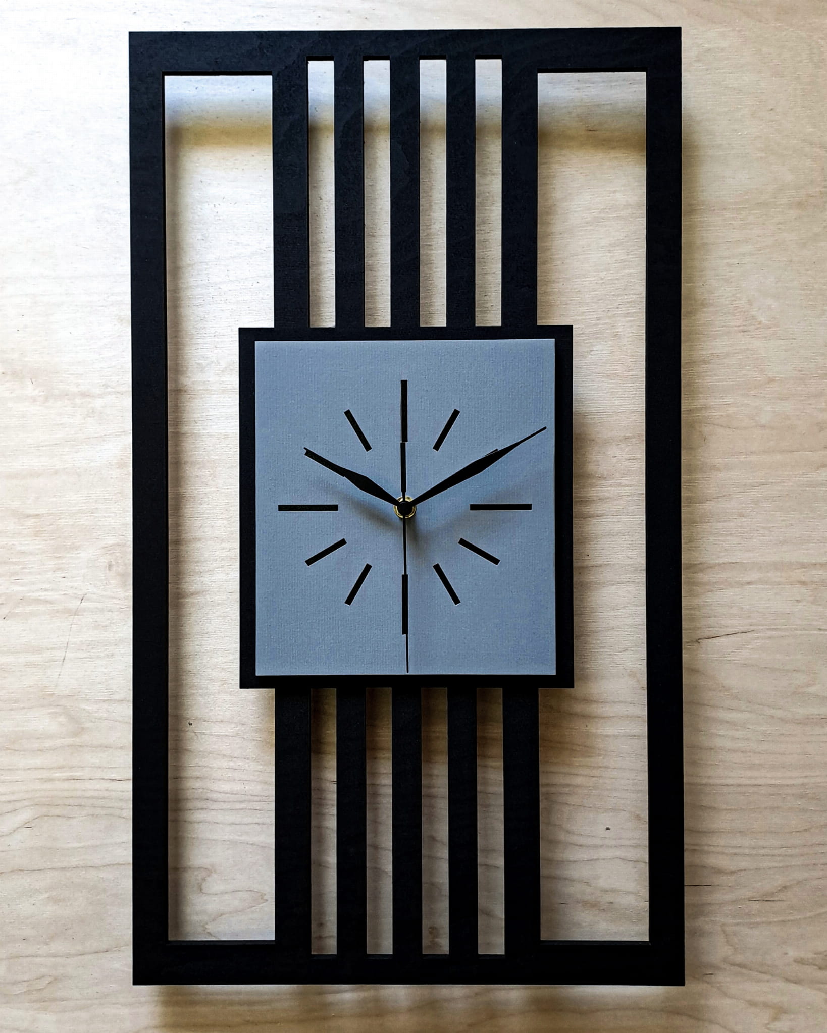 DUŻY, MINIMALISTYCZNY, NOWOCZESNY ZEGAR ŚCIENNY, LAMELE, INDUSTRIALNY, GEOMETRYCZNY, DO SALONU, MINIMALISTYCZNY, LOFT, HANDMADE, DREWNIANY, 35 x 60 cm, PIONOWY, CZARNY/ SZARY, CICHY