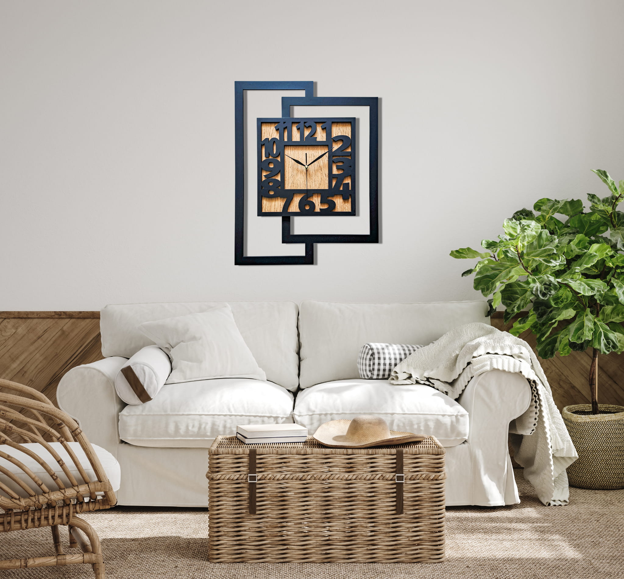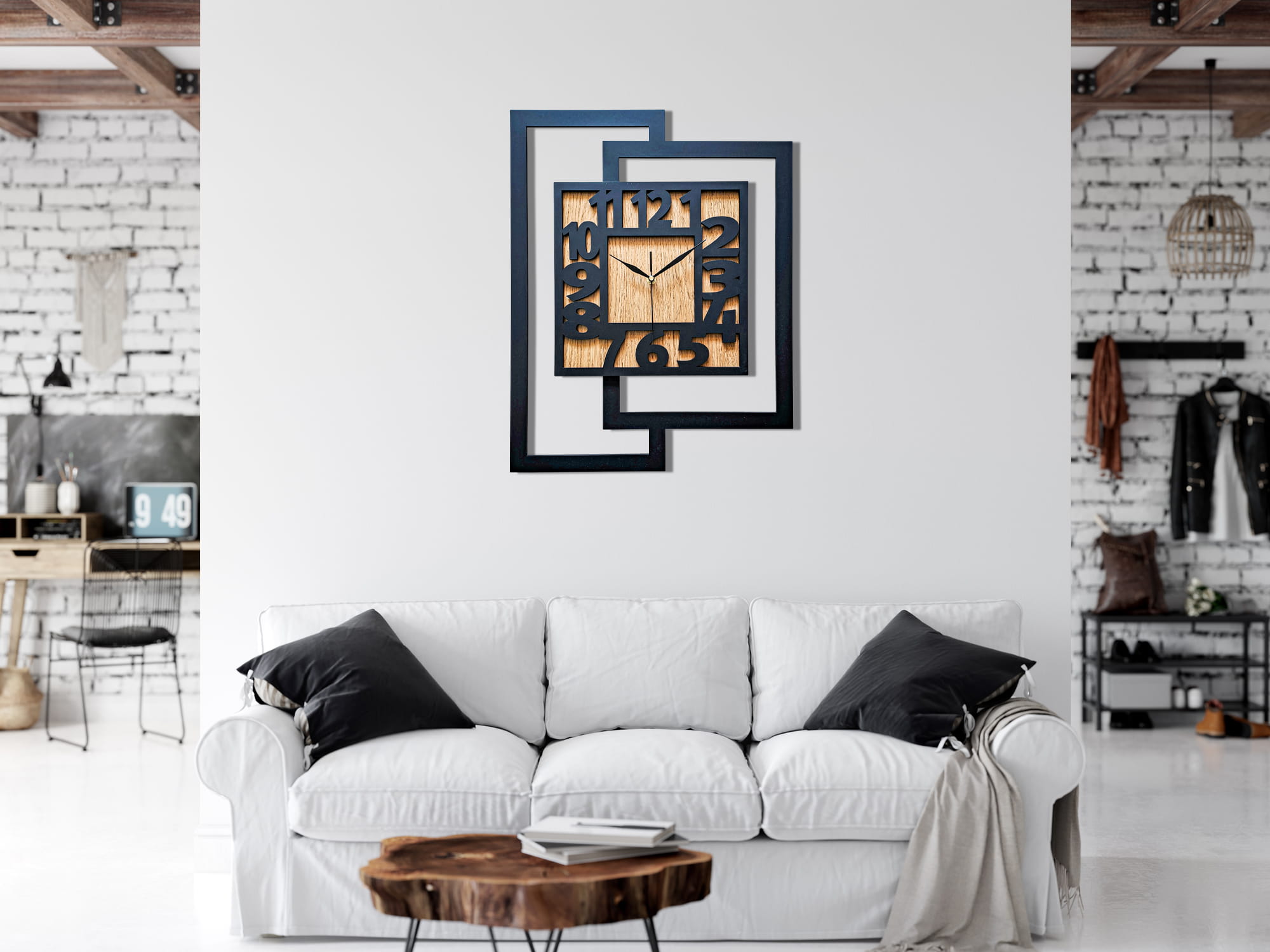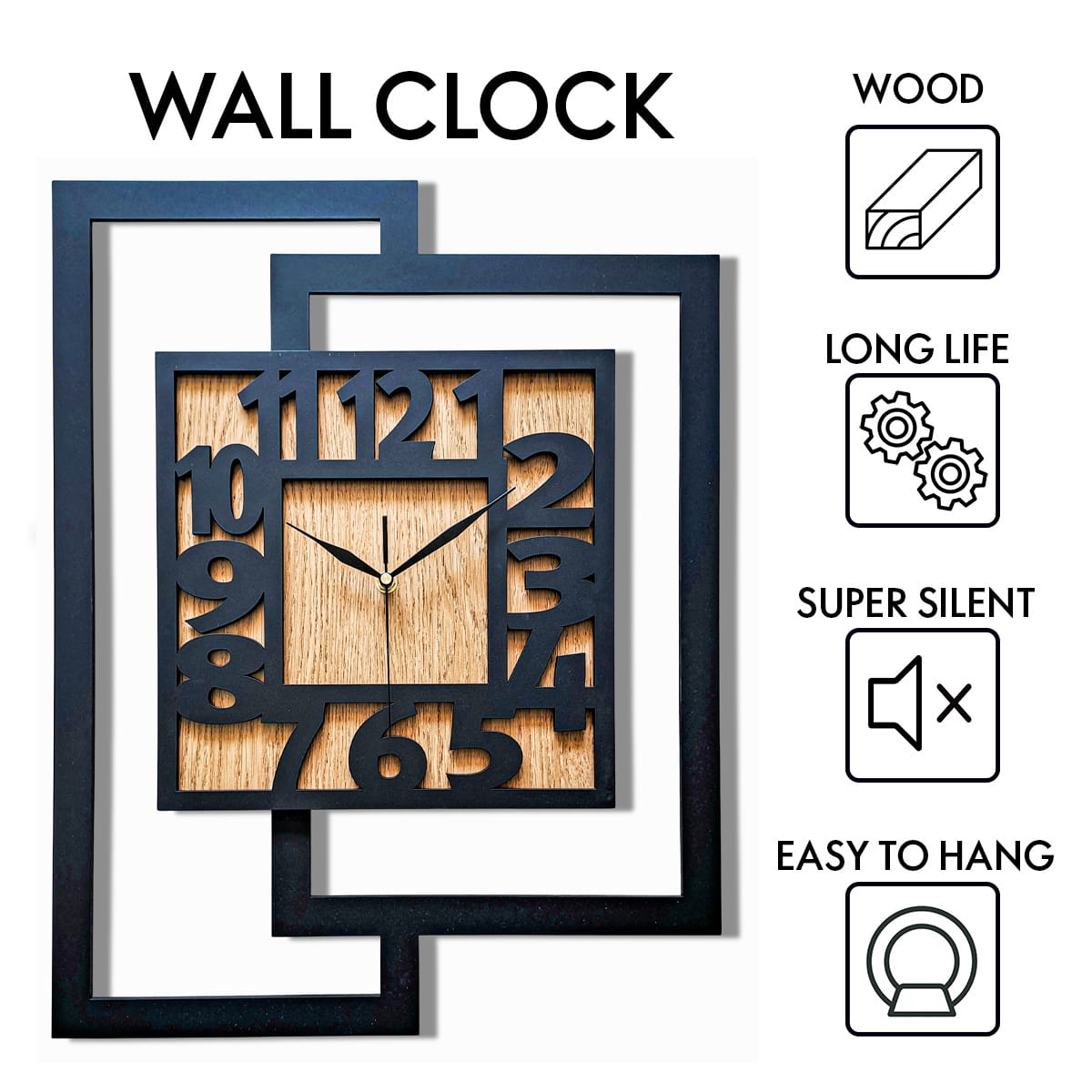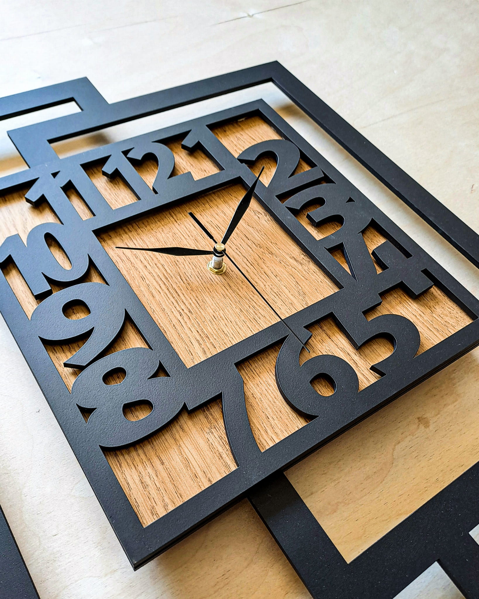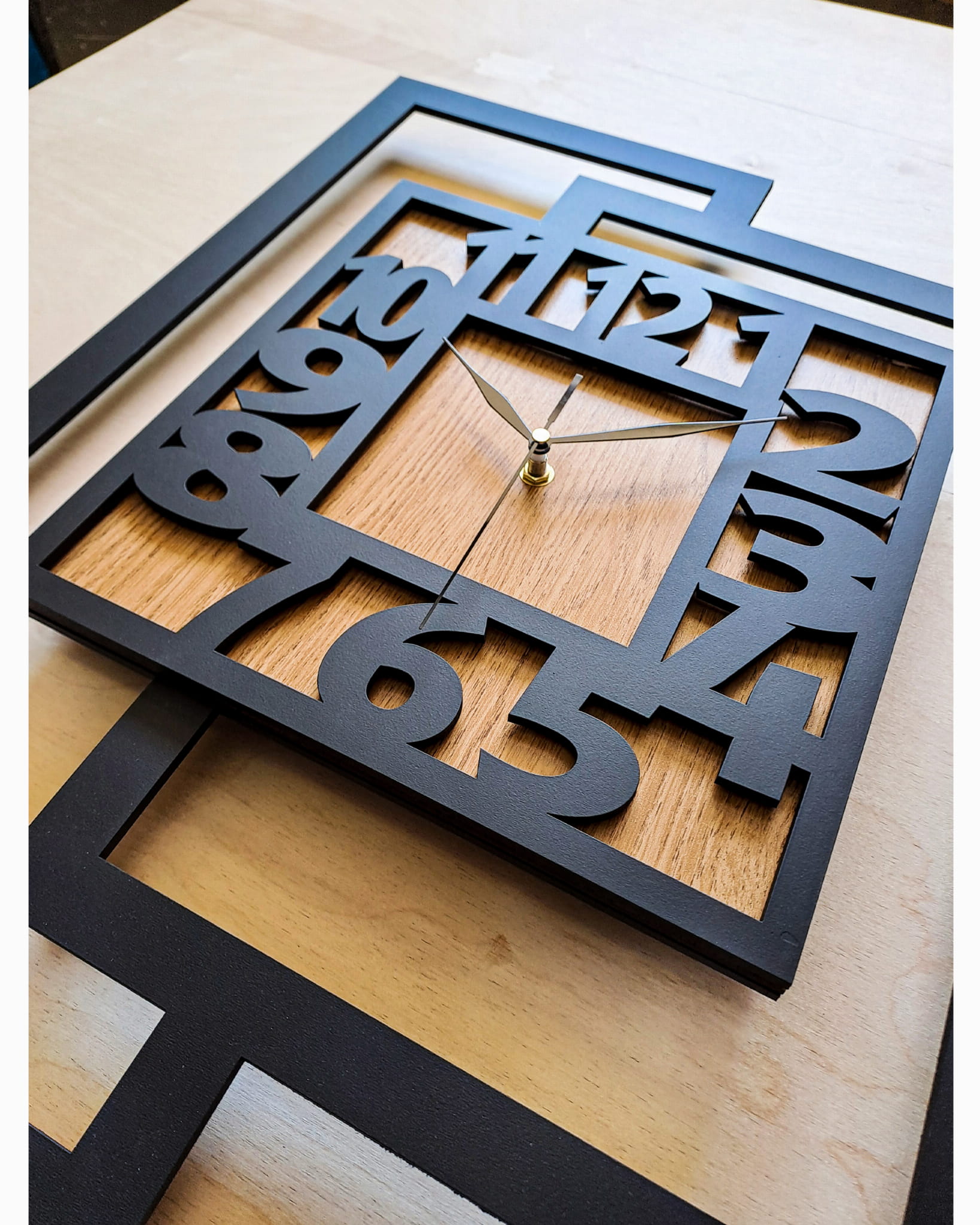 DUŻY, NOWOCZESNY, DEKORACYJNY INDUSTRIALNY ZEGAR ŚCIENNY,GEOMETRYCZNY, DO SALONU, MINIMALISTYCZNY, LOFT, HANDMADE, DREWNIANY, CZARNY/ DĄB ZŁOTY, 44 x 56 cm, CICHY