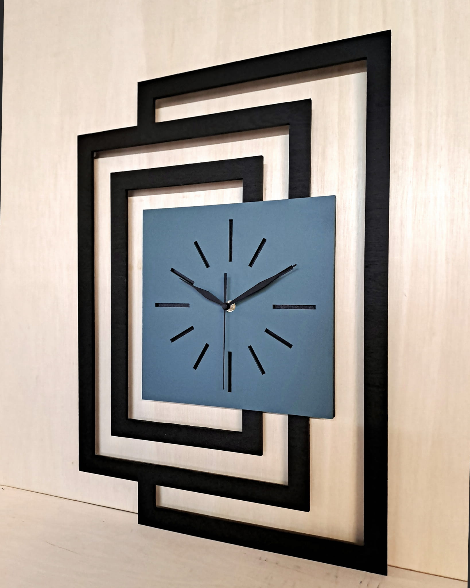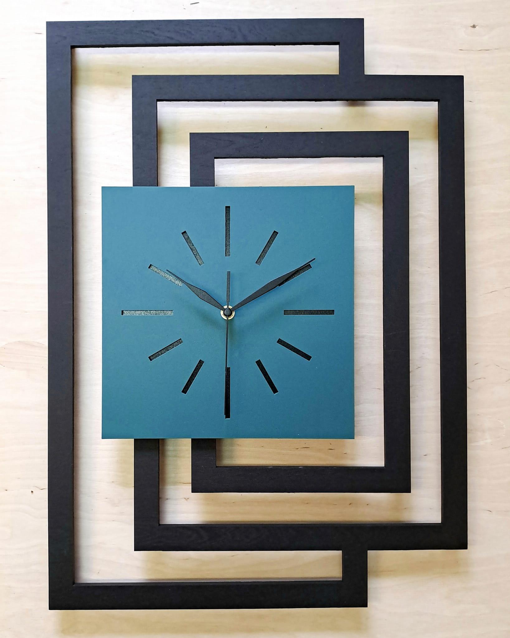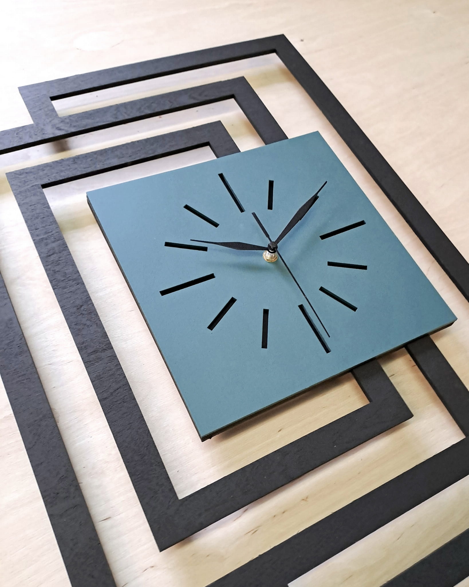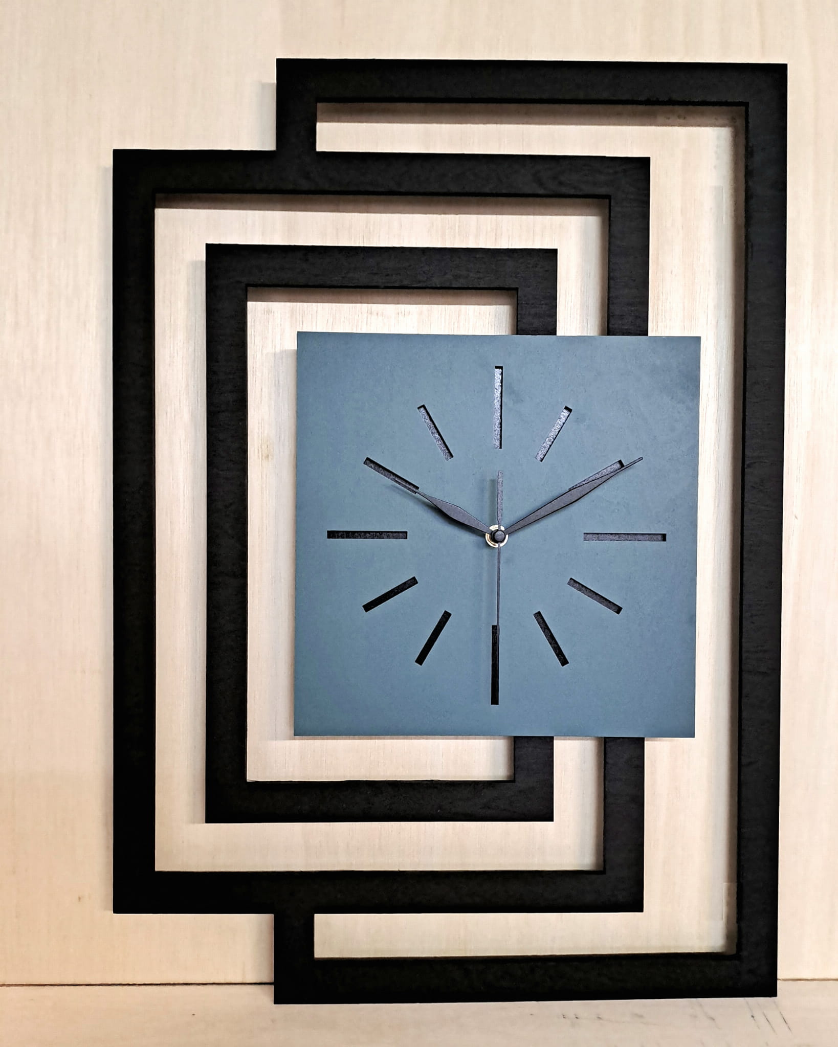 GRUBOŚĆ MATERIAŁU z którego wykonujemy ramę zegara - 5 mm bo tylko w takiej grubości możliwe jest precyzyjne cięcie laserowe , grubość całego zegara 3 cm ( 3 warstwy sklejki 5 mm + mechanizm 15 mm )