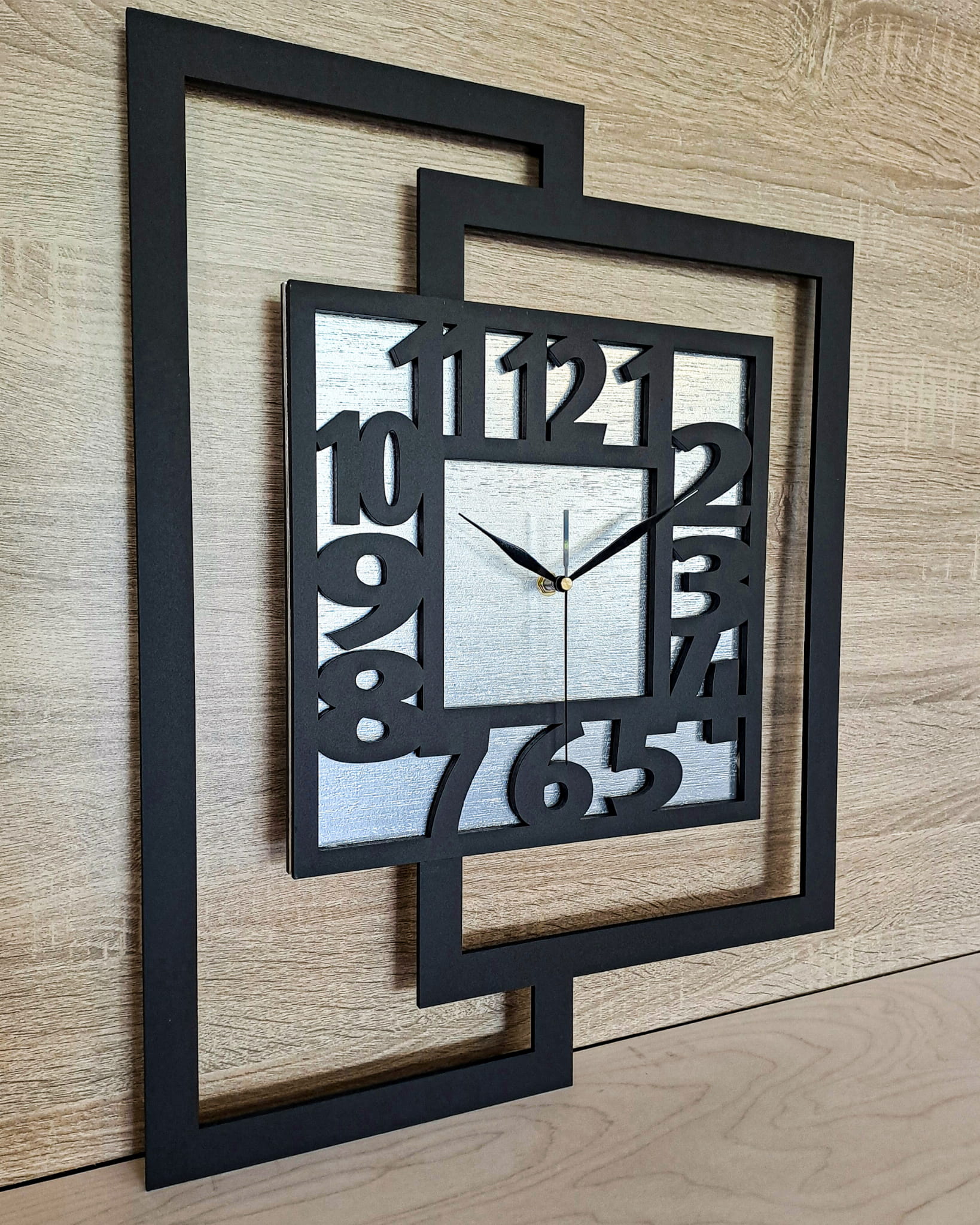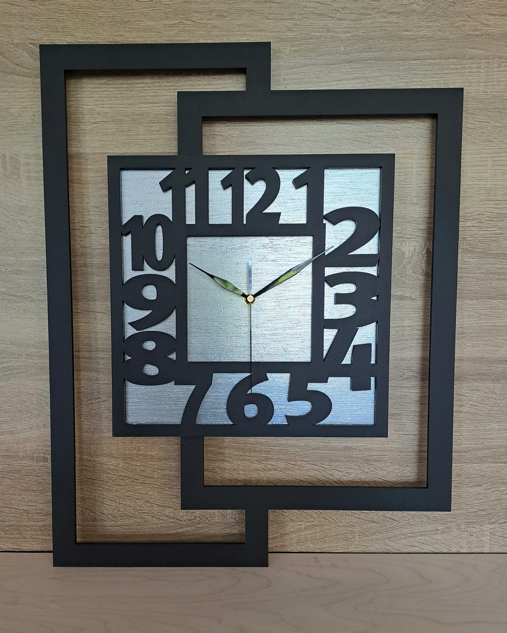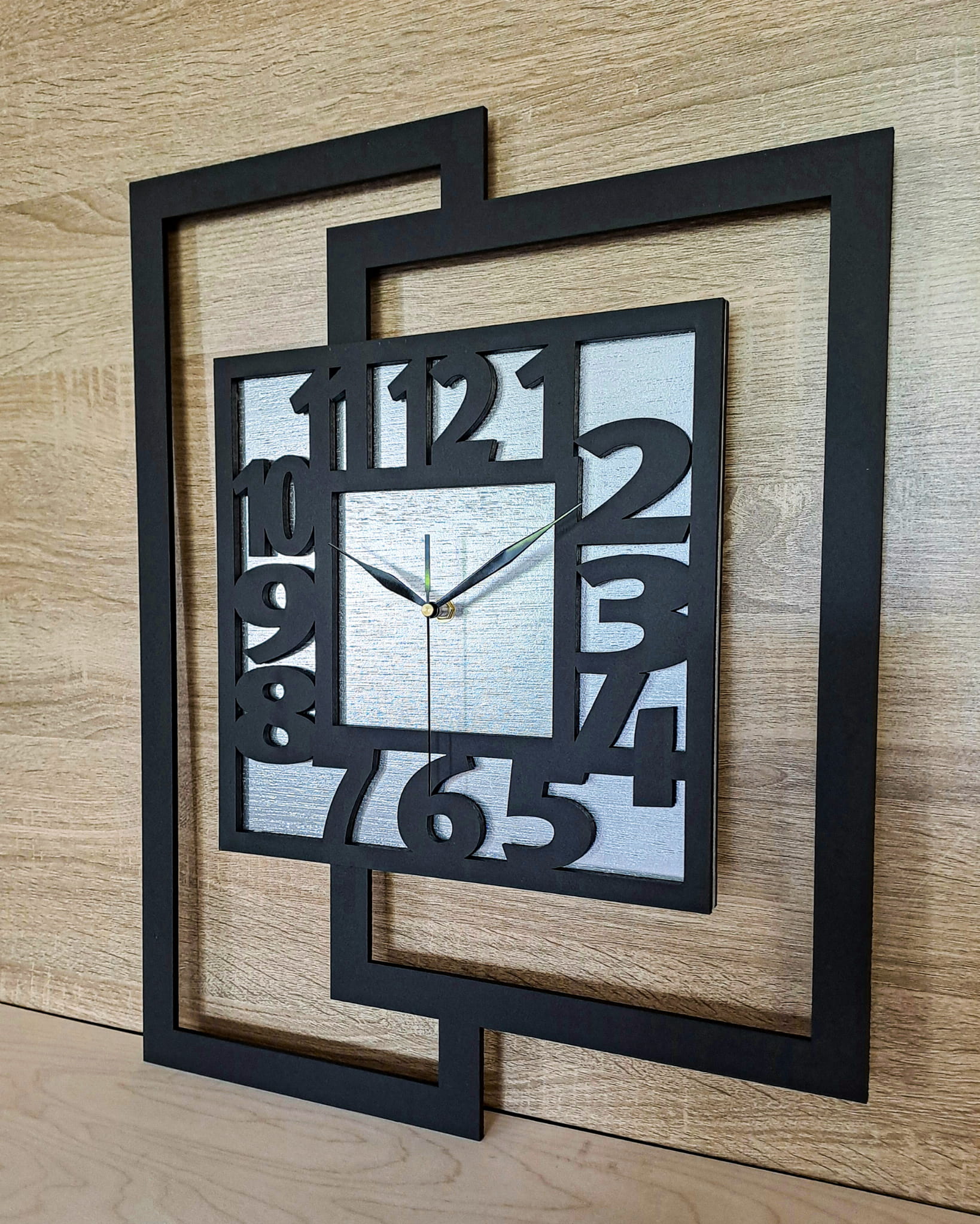 DUŻY, NOWOCZESNY ZEGAR ŚCIENNY,GEOMETRYCZNY, DO SALONU, MINIMALISTYCZNY, LOFT, HANDMADE, SREBRNY, 44 x 56 cm