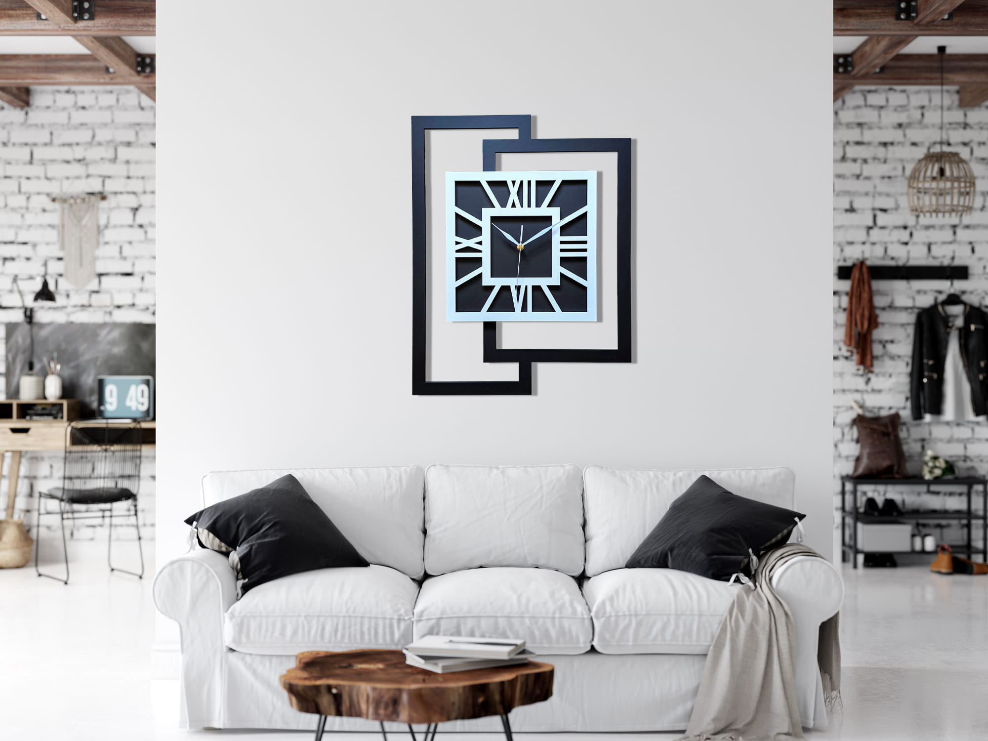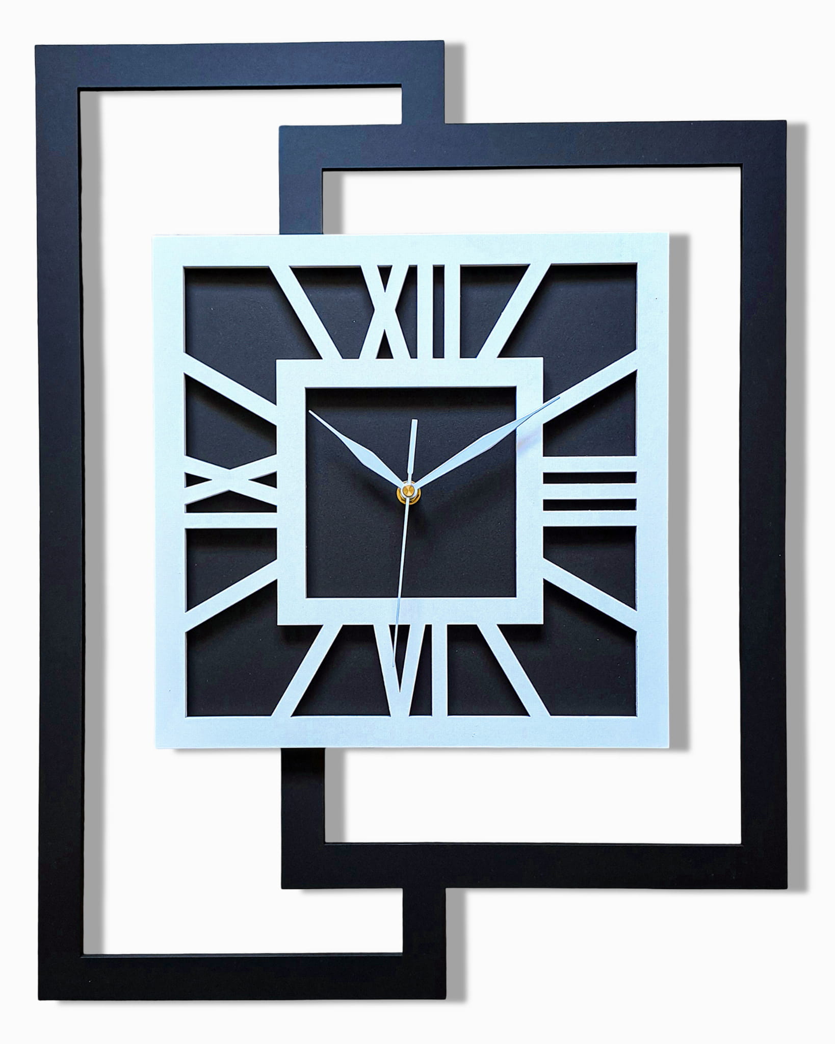 DUŻY, NOWOCZESNY ZEGAR ŚCIENNY,GEOMETRYCZNY, MINIMALISTYCZNY, LOFT, HANDMADE, CZARNO - BIAŁY, 44 x 56 cm