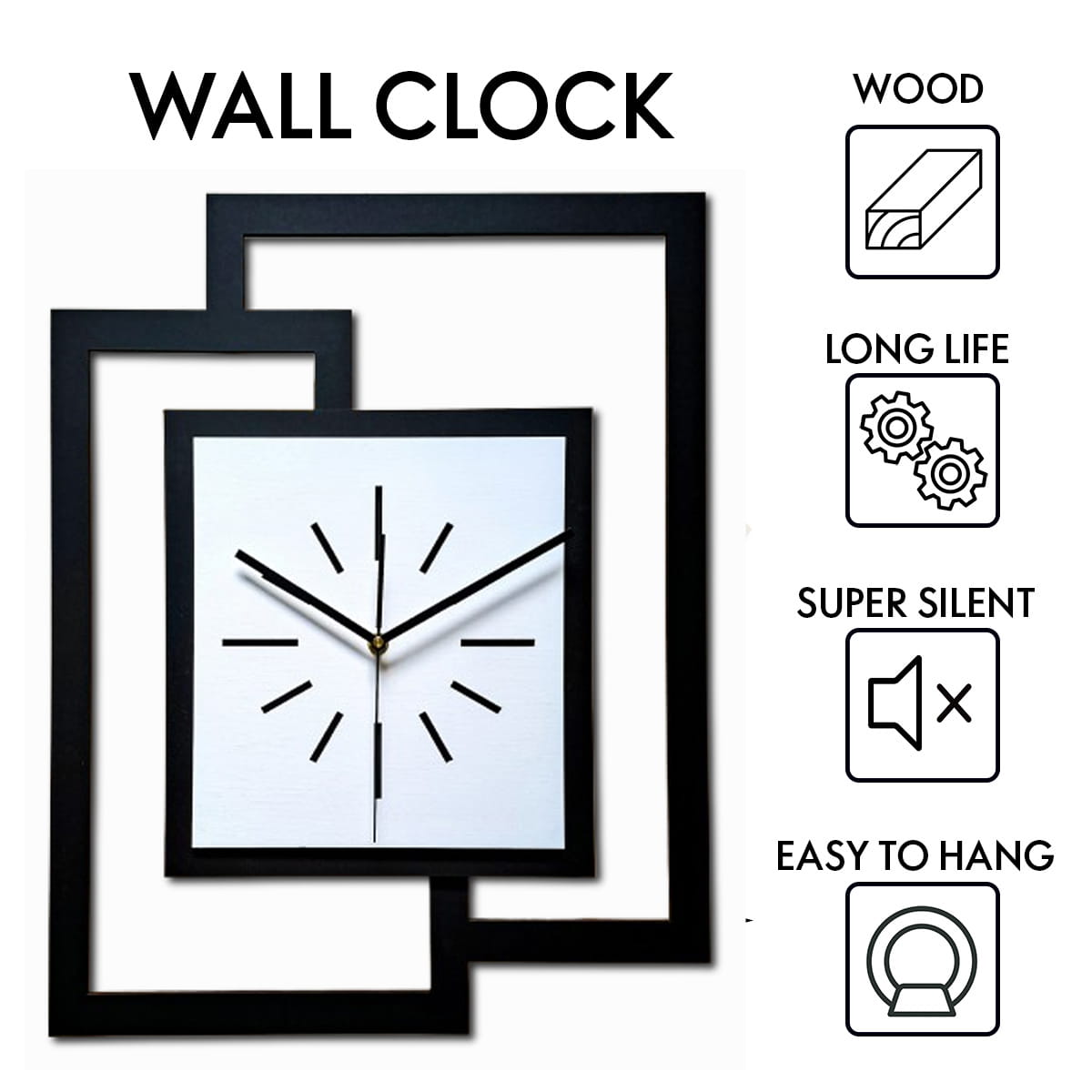 DUŻY, NOWOCZESNY ZEGAR ŚCIENNY,GEOMETRYCZNY, PROSTOKĄT, ABSTRAKCYJNY, MINIMALISTYCZNY, LOFT, HANDMADE, DREWNO, BIAŁY, 44 x 56 cm