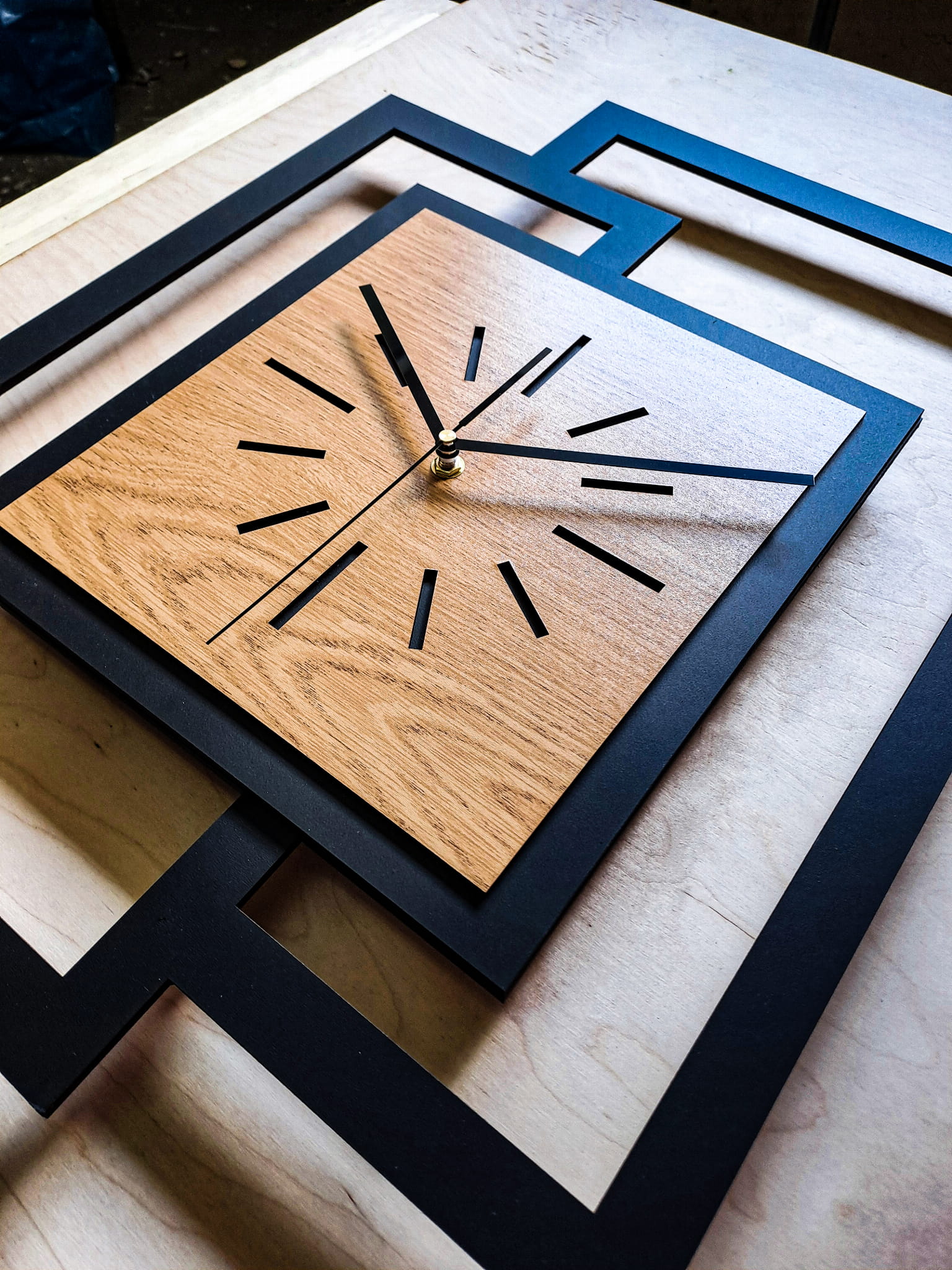 GRUBOŚĆ MATERIAŁU z którego wykonujemy ramę zegara - 5 mm bo tylko w takiej grubości możliwe jest precyzyjne cięcie laserowe , grubość całego zegara 2,5 cm ( 2 warstwy sklejki 5 mm + mechanizm 15 mm )