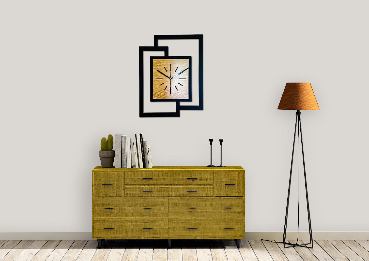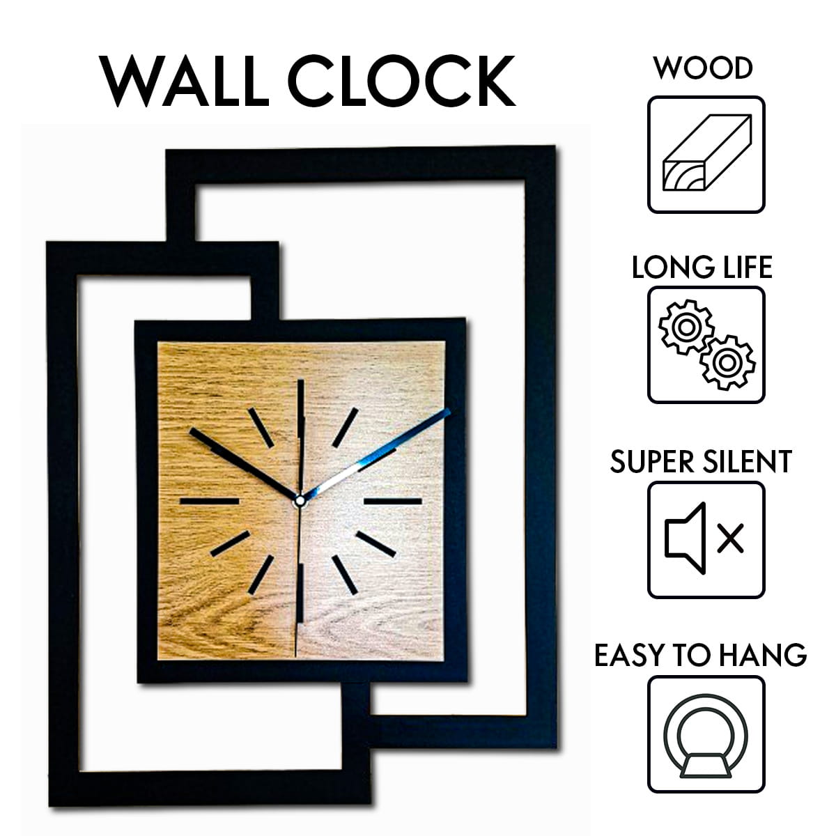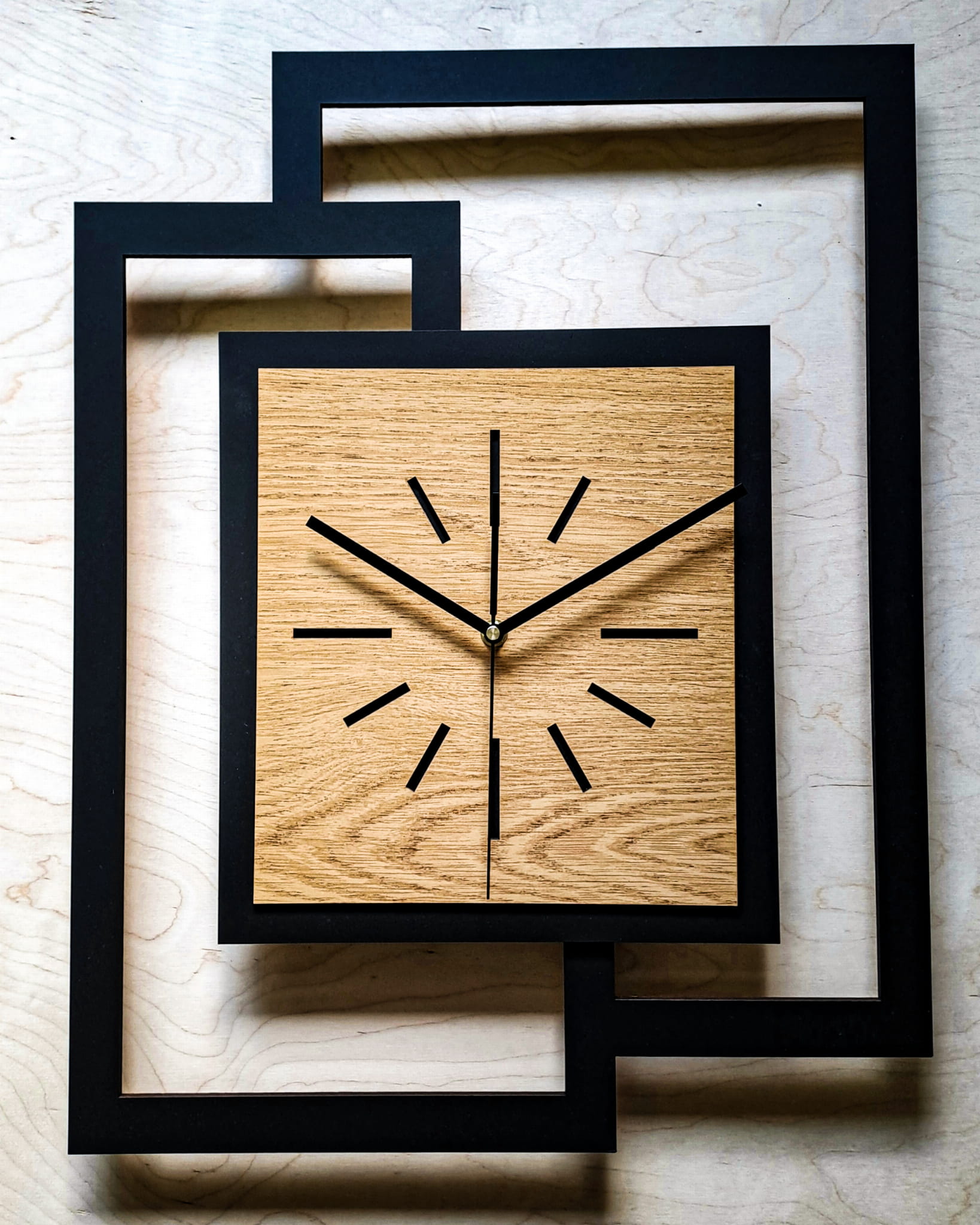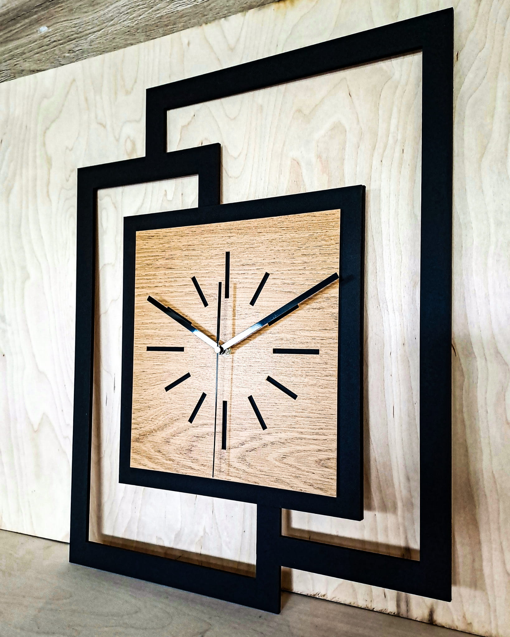 DUŻY, NOWOCZESNY ZEGAR ŚCIENNY,GEOMETRYCZNY, PROSTOKĄT, ABSTRAKCYJNY, MINIMALISTYCZNY, LOFT, HANDMADE, DREWNO, ZŁOTY DĄB 44 x 56 cm