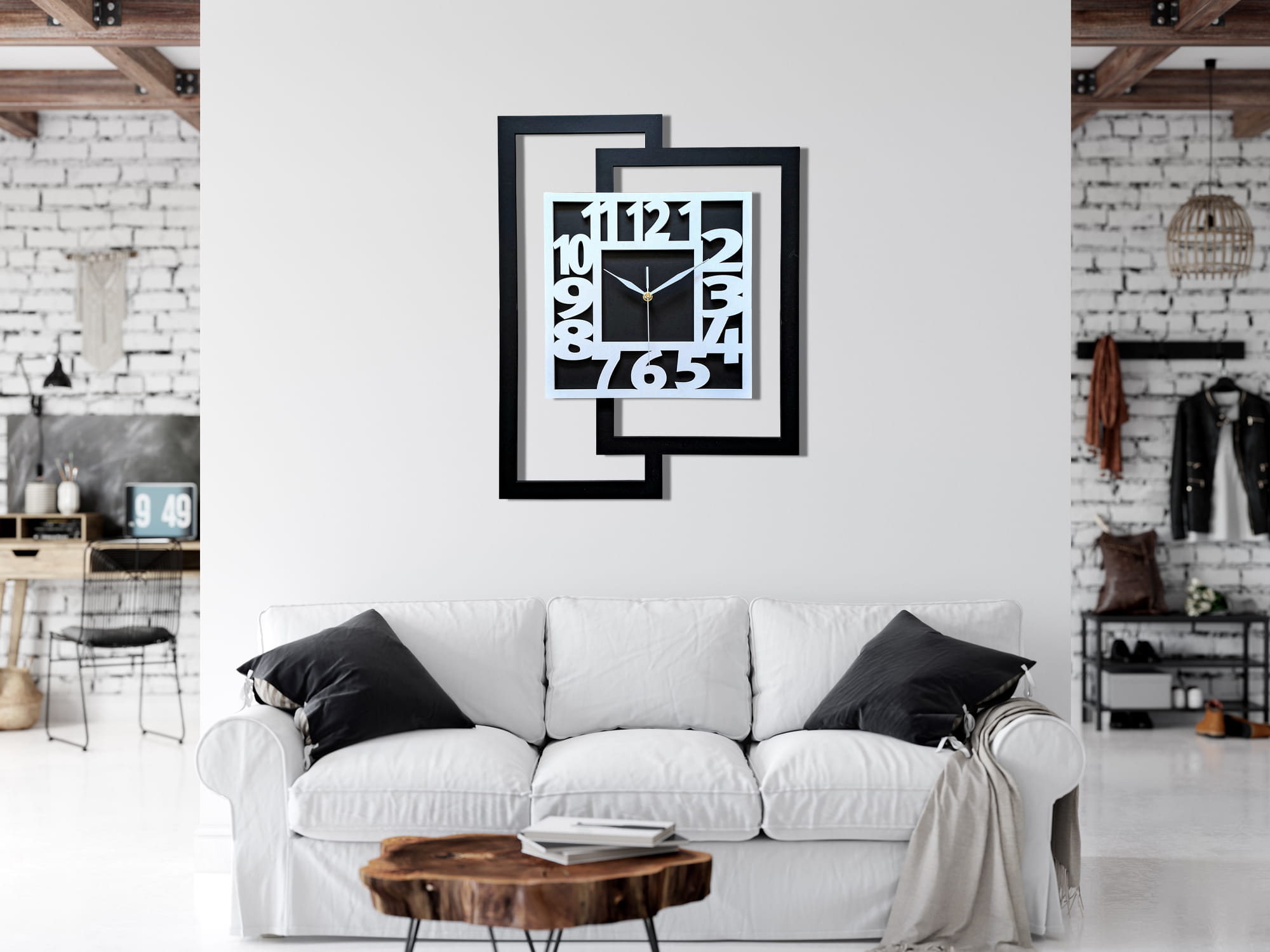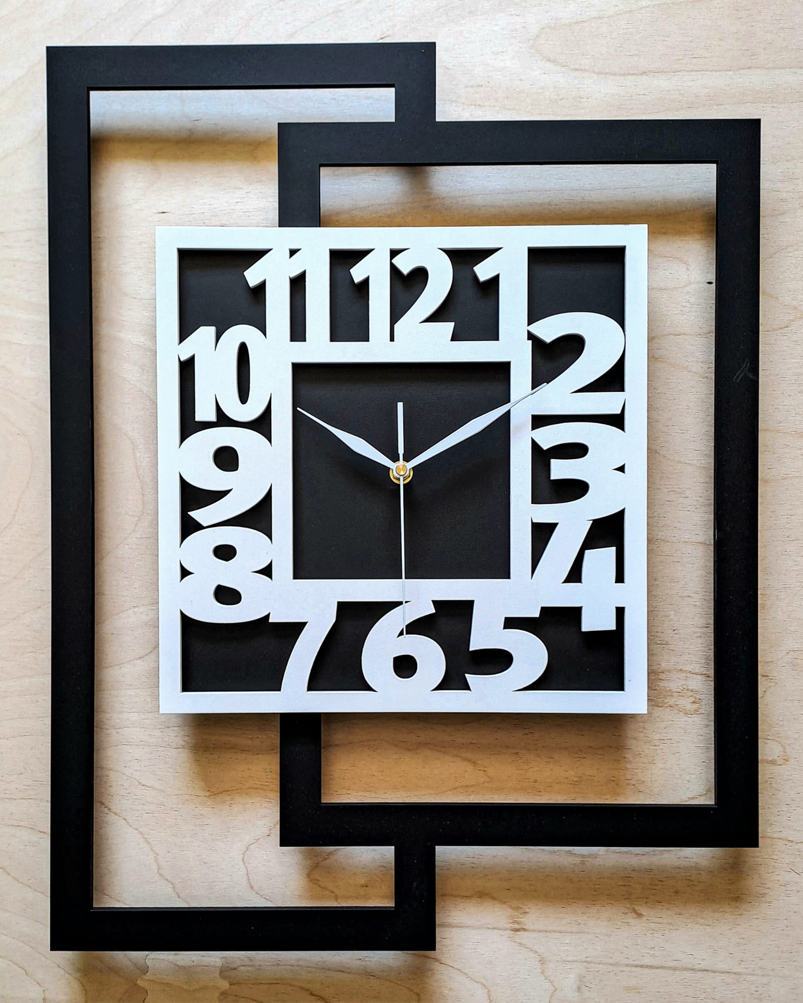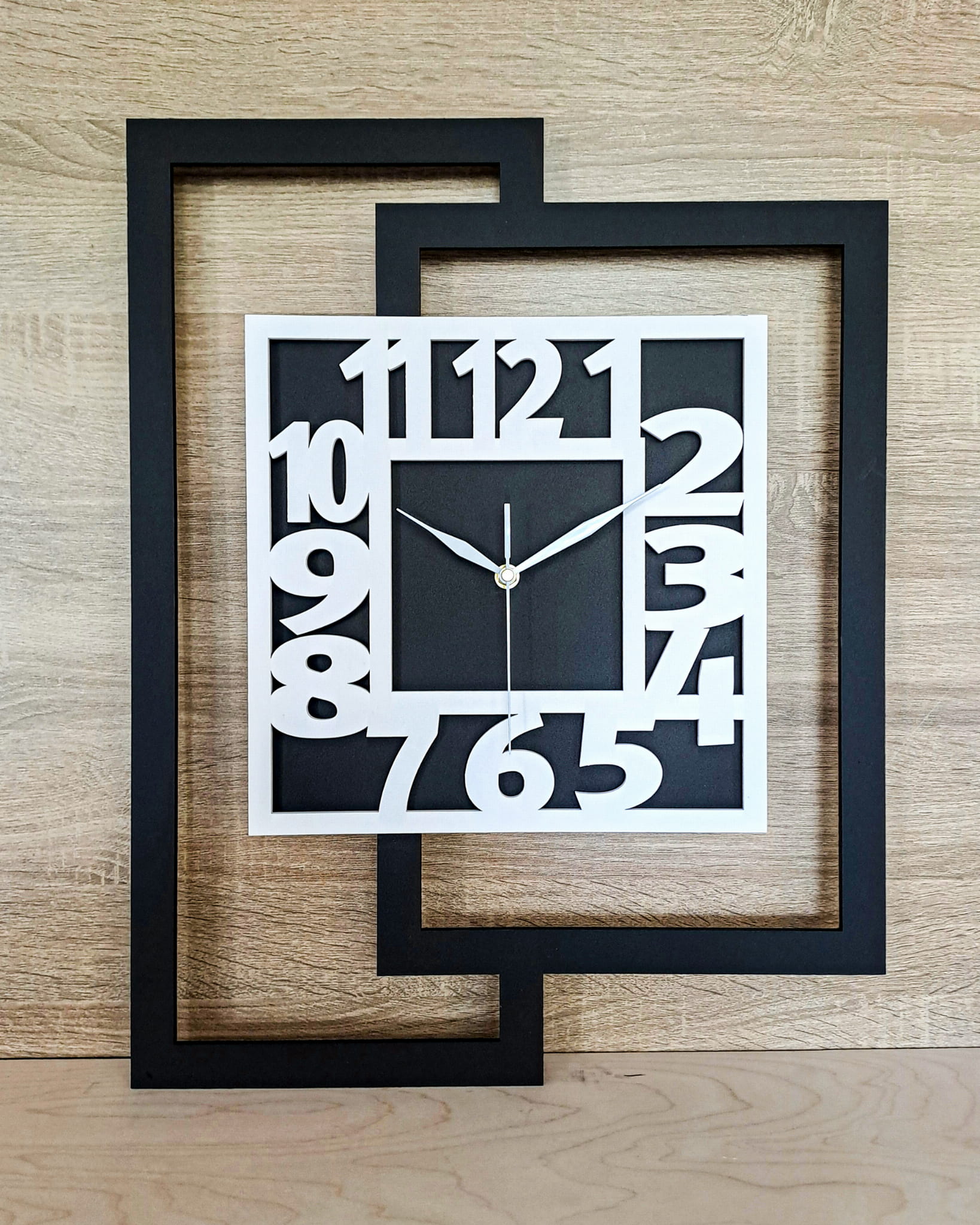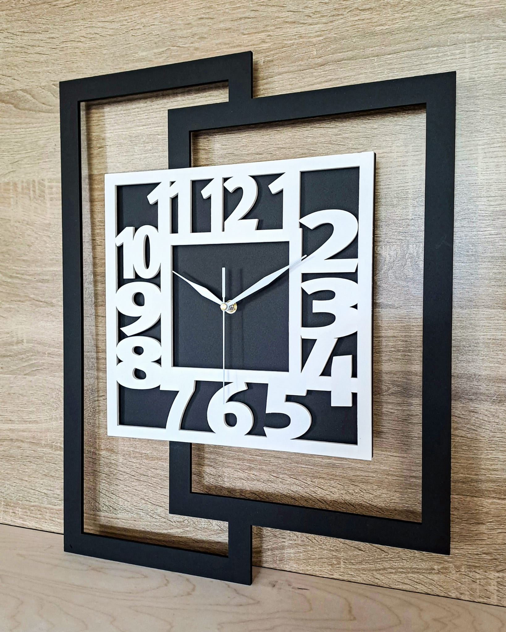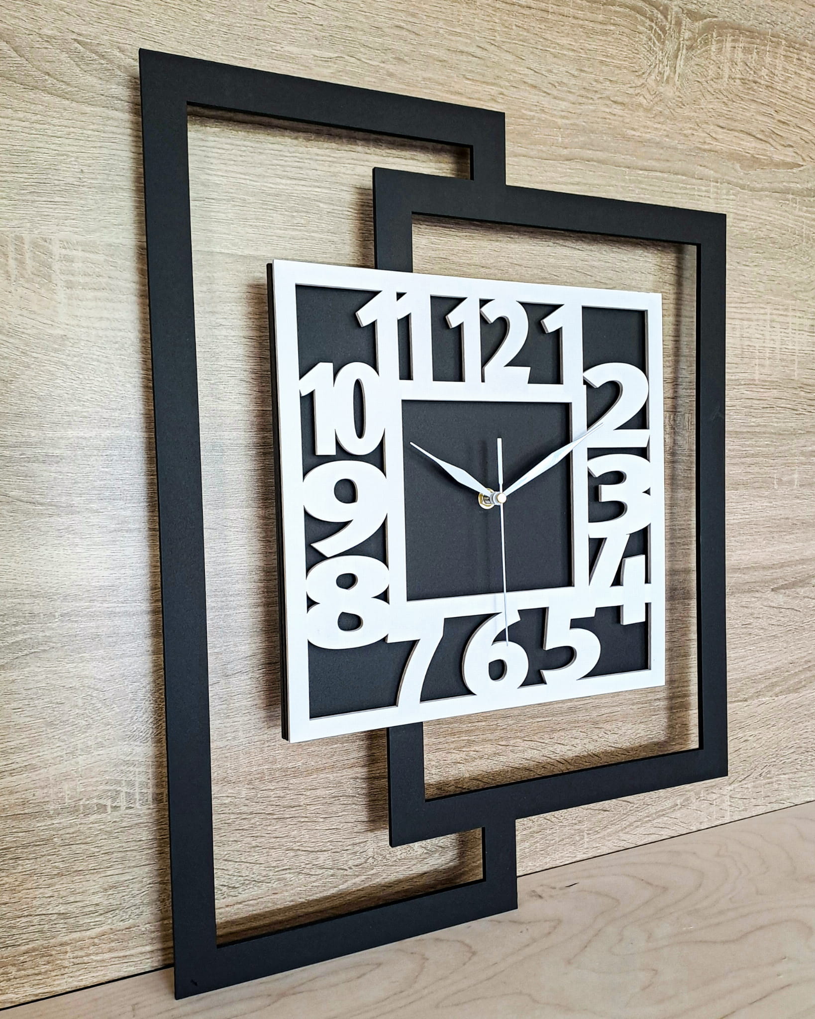 DUŻY, NOWOCZESNY ZEGAR ŚCIENNY DO SALONU, GEOMETRYCZNY, MINIMALISTYCZNY, LOFT, HANDMADE, BIAŁO - CZARNY, 44 x 56 cm