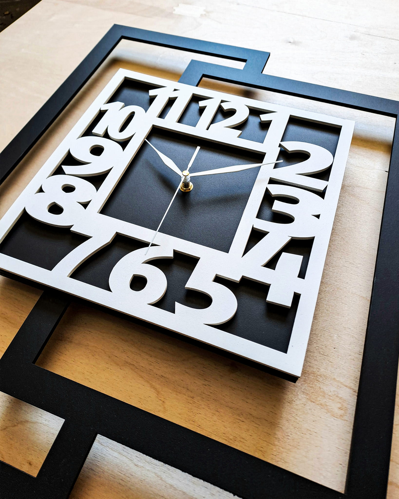 GRUBOŚĆ MATERIAŁU z którego wykonujemy ramę zegara - 5 mm bo tylko w takiej grubości możliwe jest precyzyjne cięcie laserowe , grubość całego zegara 3 cm ( 3 warstwy sklejki 5 mm + mechanizm 15 mm )